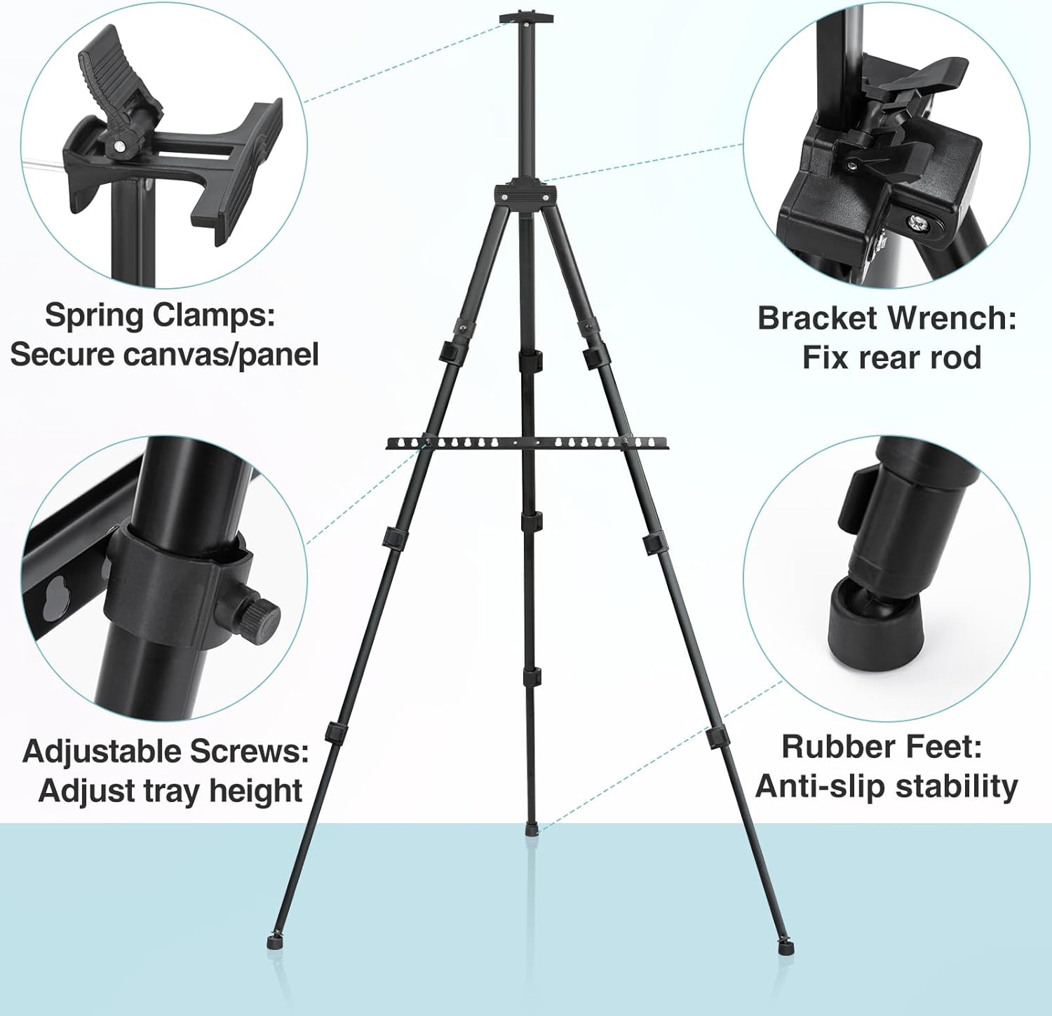 - 【Adjustable Height】The painting stand's height adjusts from 17" to 66", fitting canvases from 11" to 37", A top spring clip stabilizes the canvas, and a rotating knob provides swift adjustments for height and angle