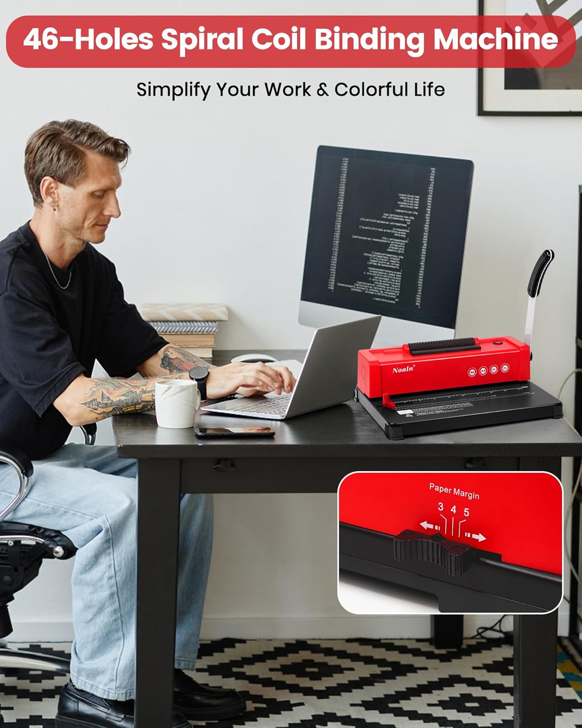 - đŻăMultiple Bindings in One Machine !ăNoaln Upgraded Spiral Coil Binding Machine with Electric Coil Inserter helps to create professional-looking bound books in the office or at home quickly and easily. It's Vibrant Christmas Red look can be adapted to any home style for a touch of style and luxury. Make Documents, Contracts, Materials/Assignments, Teaching Books, Picture Books/Diary, Travel Tips/Notebooks, Photo Albums, Recipes, etc. It can also be a practical and educational gift!