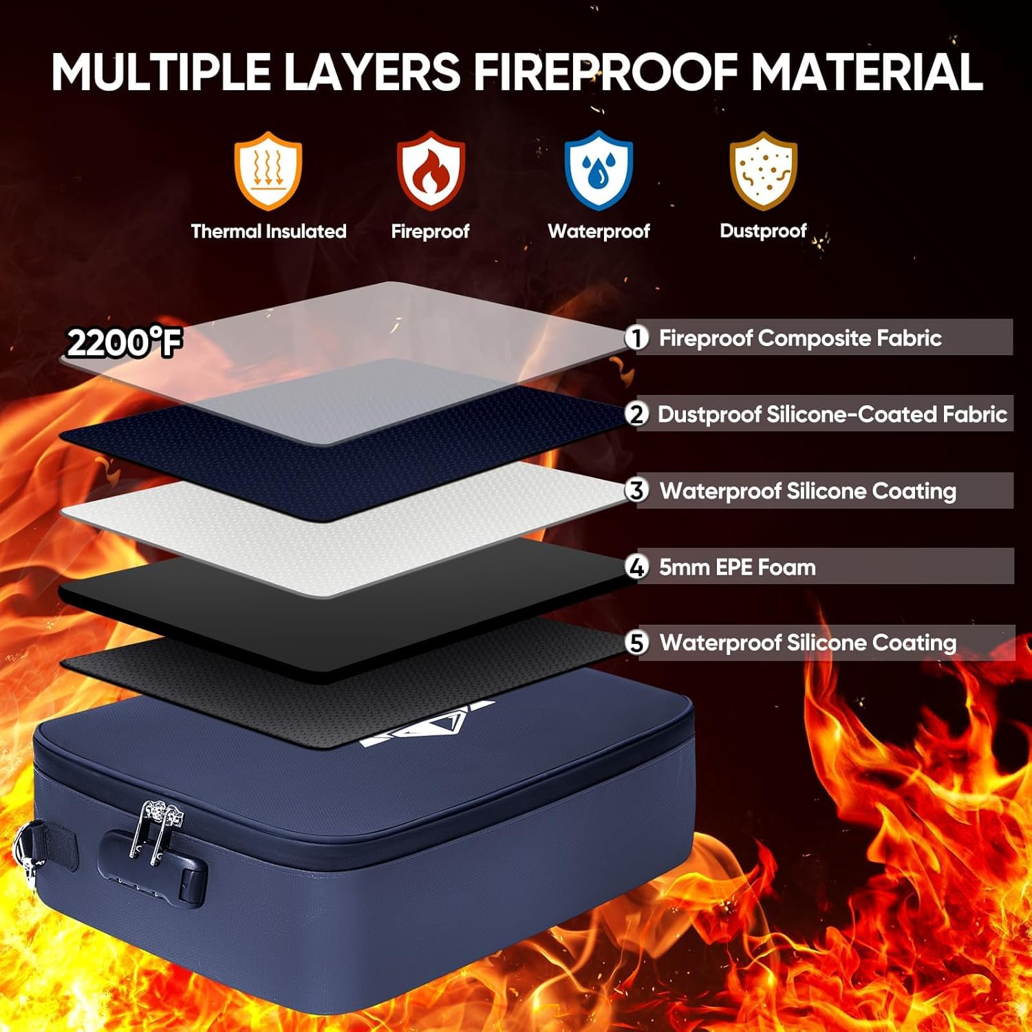 - Fireproof and Waterproof: The fireproof document box /bag is made of dust-proof silicone fiberglass, offering fire resistance up to 2192℉, SGS-certified (UL94 VTM-0); Its waterproof design protects your documents from rain and spills (No folders included)
