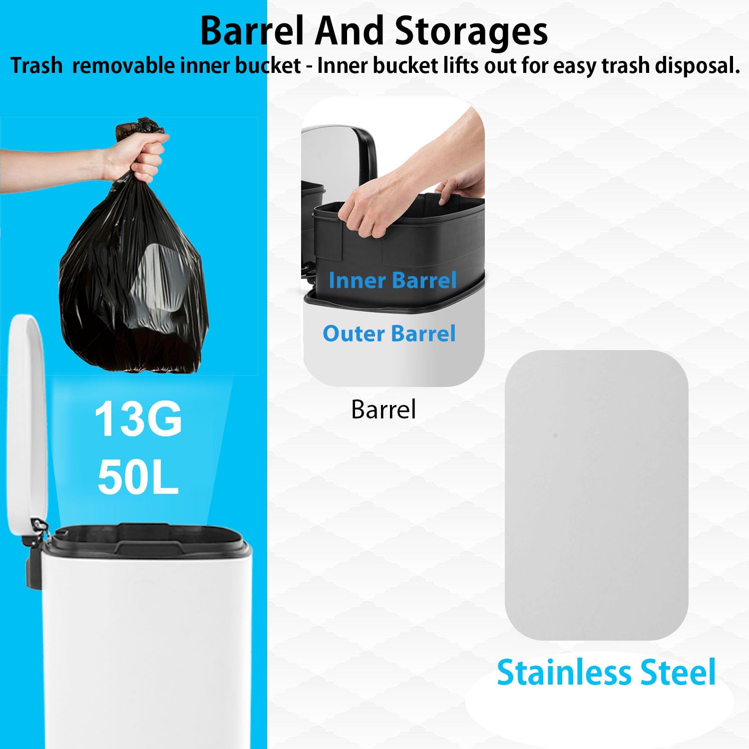 - 13 Gallon Ultra-large Capacity: 13 gallons can absolutely meet your daily use, in the kitchen table next to a kitchen trash can, you will be more convenient to deal with kitchen waste. The regular 13-gallon garbage bag in the supermarket can be used in our stainless steel trash can, and it's kind of you to use a bigger bag. The lid of the garbage can is removable, it’s convenient for you to put in and take out the garbage bag.step trash can kitchen trash can bedroom trash can