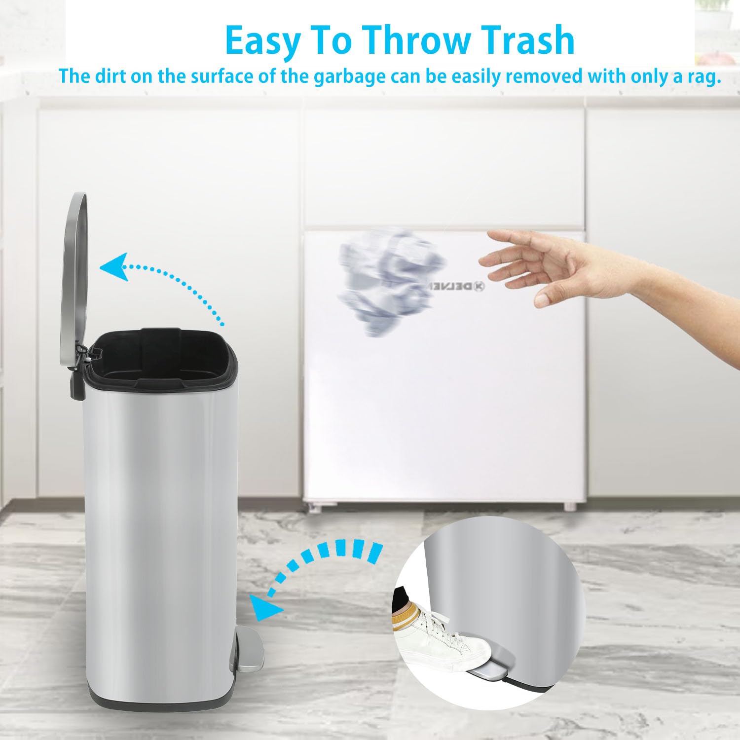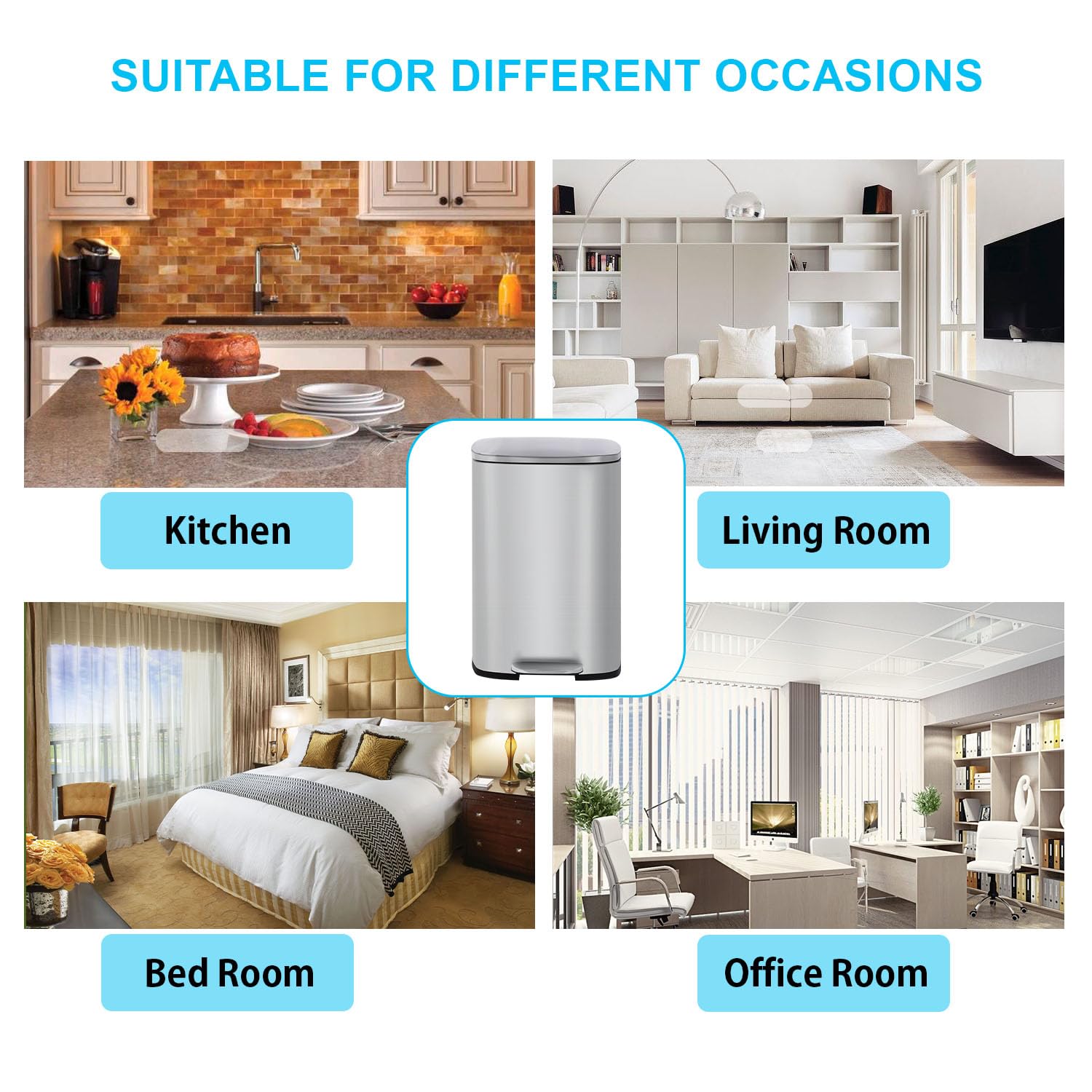 - 13 Gallon Ultra-large Capacity: 13 gallons can absolutely meet your daily use, in the kitchen table next to a kitchen trash can, you will be more convenient to deal with kitchen waste. The regular 13-gallon garbage bag in the supermarket can be used in our stainless steel trash can, and it's kind of you to use a bigger bag. The lid of the garbage can is removable, it’s convenient for you to put in and take out the garbage bag.step trash can kitchen trash can bedroom trash can
