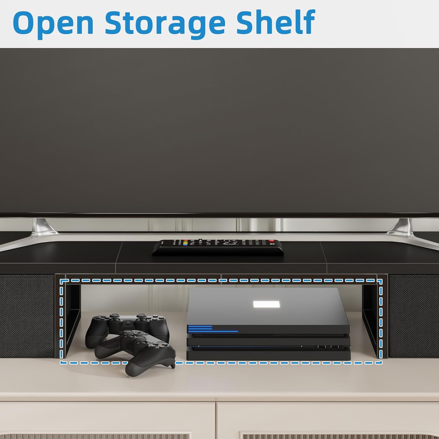 - ăMiddle Open Storage SpaceăKeep your DVD player, tv box, audio receiver, soudbar and gaming console in the middle open storage space. Get rid of messy tabletop just in seconds.