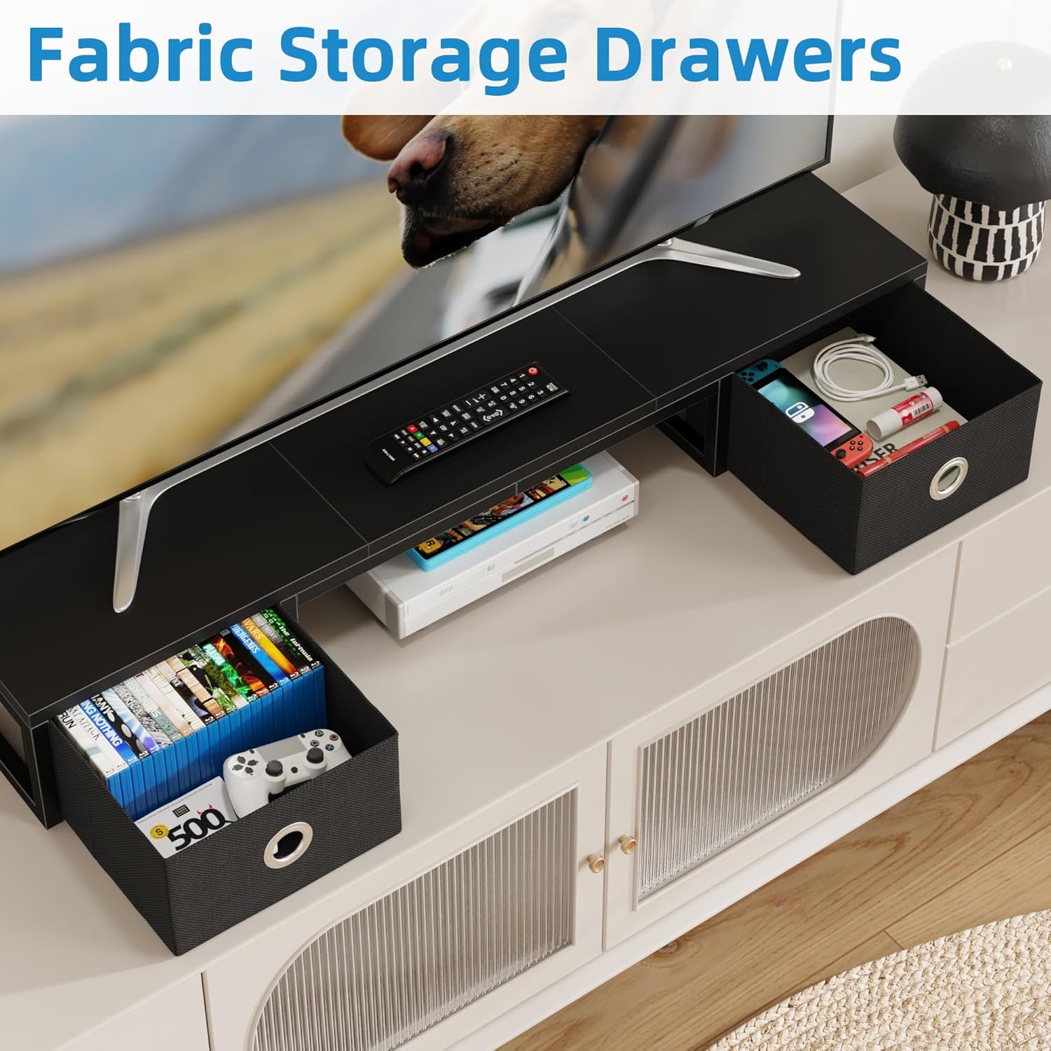 - ăTV Riser with Fabric DrawersăTV shelf design with 2 drawers, offer a privacy space to storage your media remote, CDs and magazines etc. Maximize your tabletop with this tv riser stand to maintain a clean, organized look.