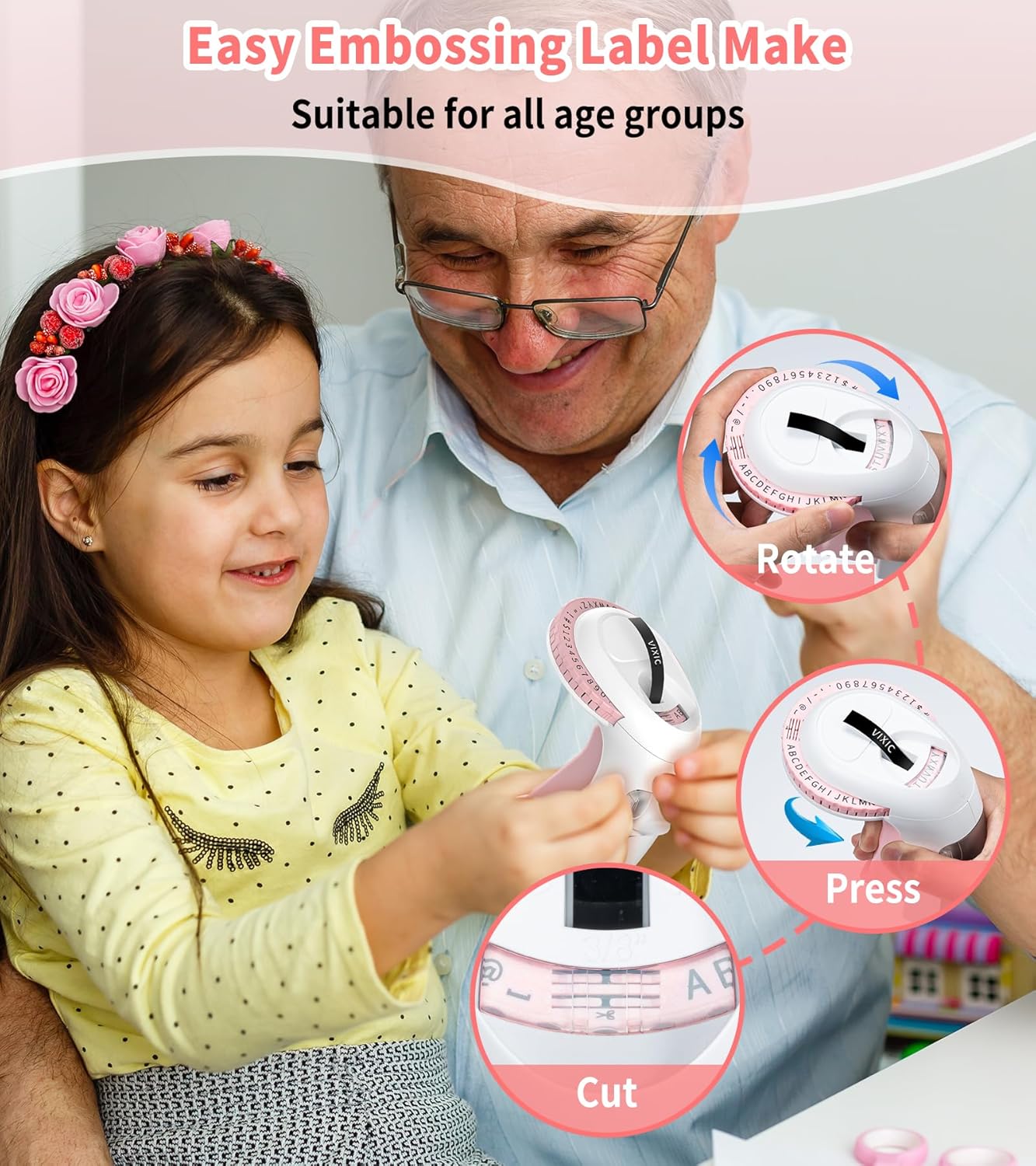 - Ergonomically Designed Label Maker: The Vixic 3D Embosser Label Maker features an ergonomically designed handle for easy operation. The emboss label maker comes with a built-in cutting mechanism and pre-cut dividers for convenient label removal, while the dotted lines simplify the labeling process