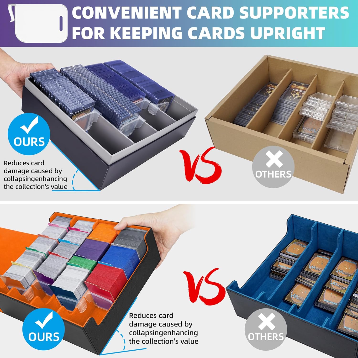 - 【Box-in-Box Design for Versatile Storage 】Features a "box-in-box" structure for ultimate organization. Card deck box storage 3200 standard cards in 4 compartments, while the triple-strength outer box can be DIY-modified to hold 600+ 3"x4" top loaders. Built-in card supporters keep your collection upright and tidy, preventing tipping or damage.