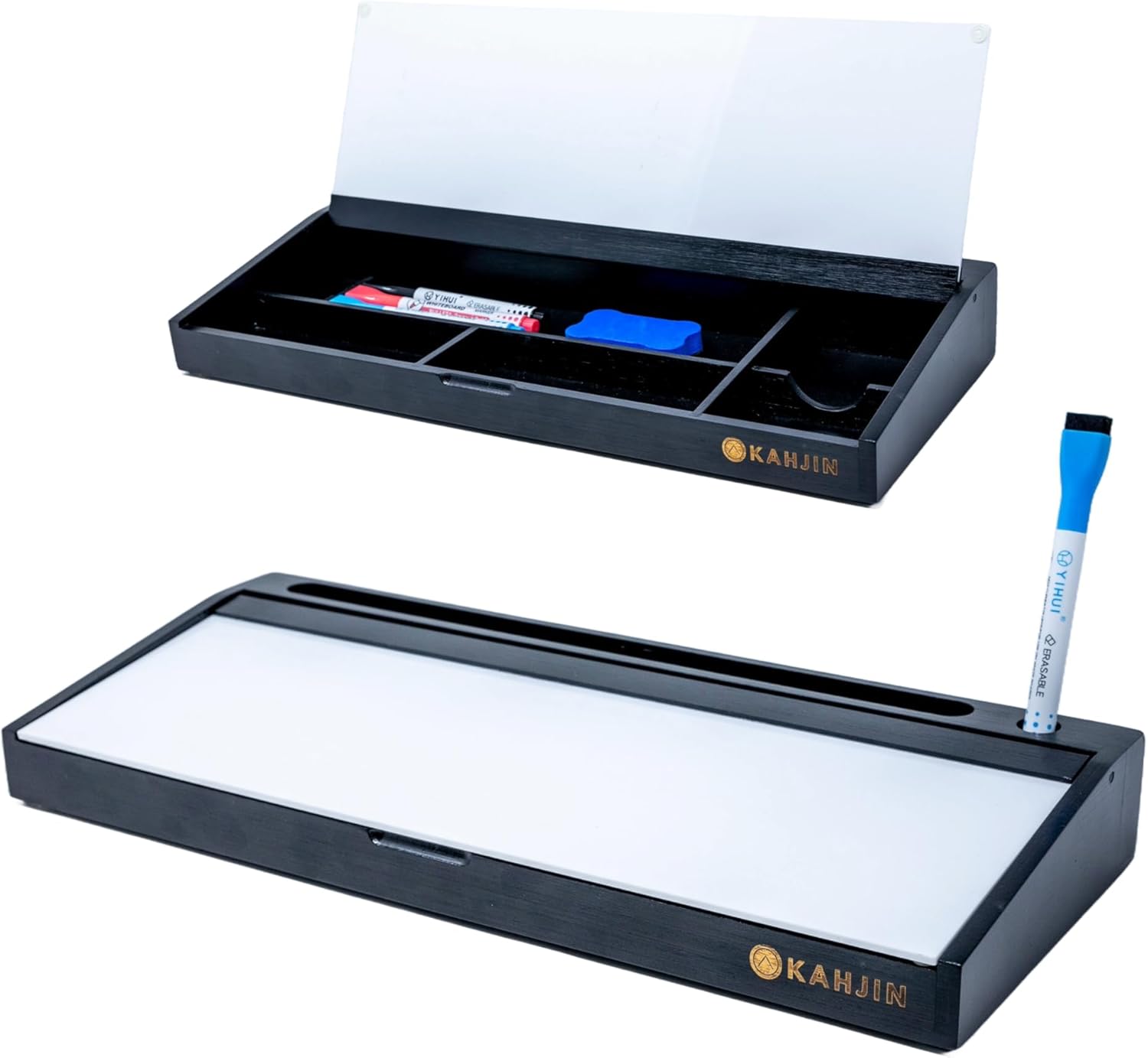 Dry Erase Desk Organizer - 16.2"x6.7"x2" with 3 Markers and 1 Eraser, KAHJIN Black Bamboo Desktop Dry Erase Board - Aesthetic Small Whiteboard for Desk Accessories at Home, Office, Cubicle, or School