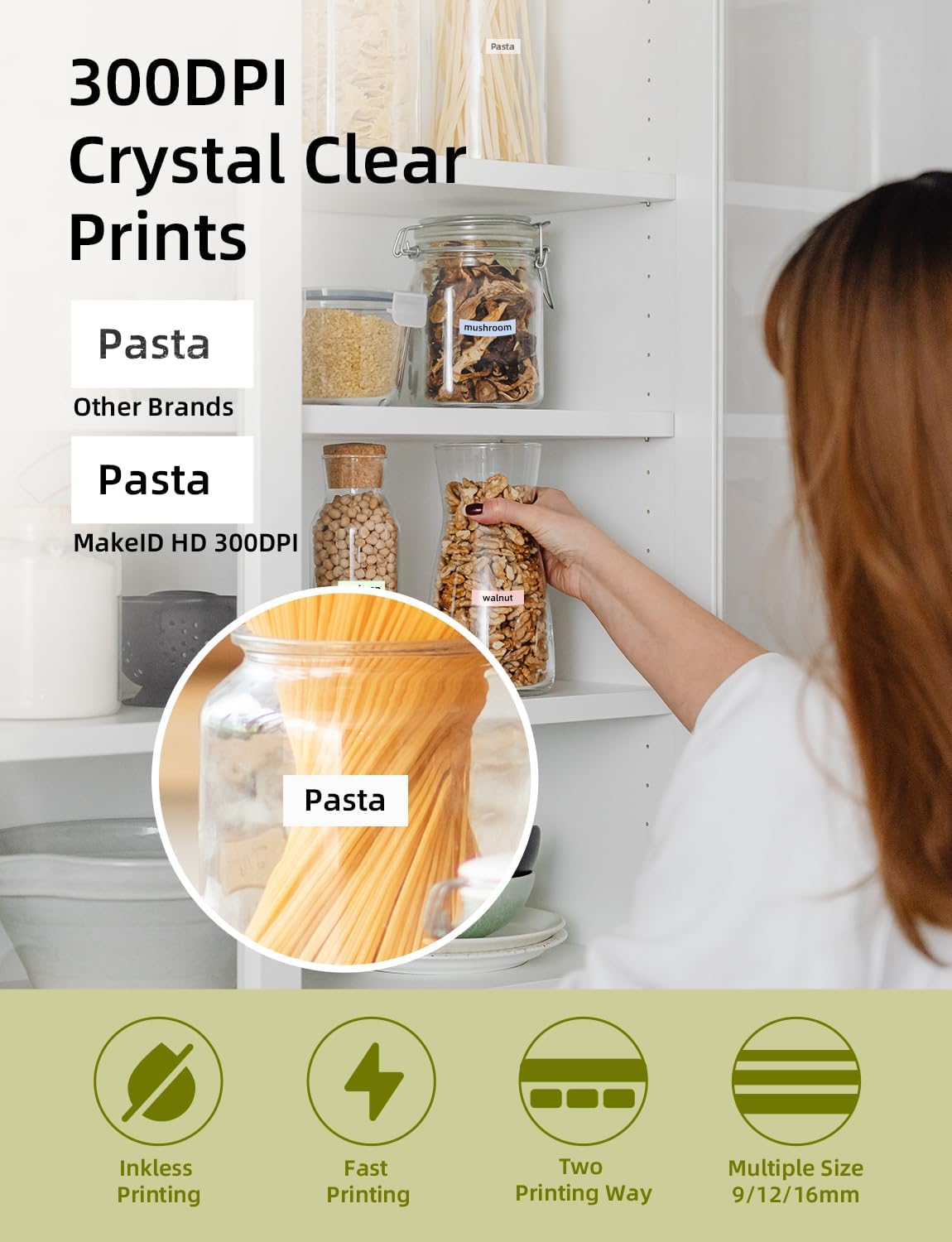 Makeid L1 HD Label Maker Machine with Tape, Portable & Rechargeable Label Makers Compatible with 9 12 16mm Waterproof Tape, Mini Bluetooth Labeler for Organizing Office Home School, 300DPI Green Tape