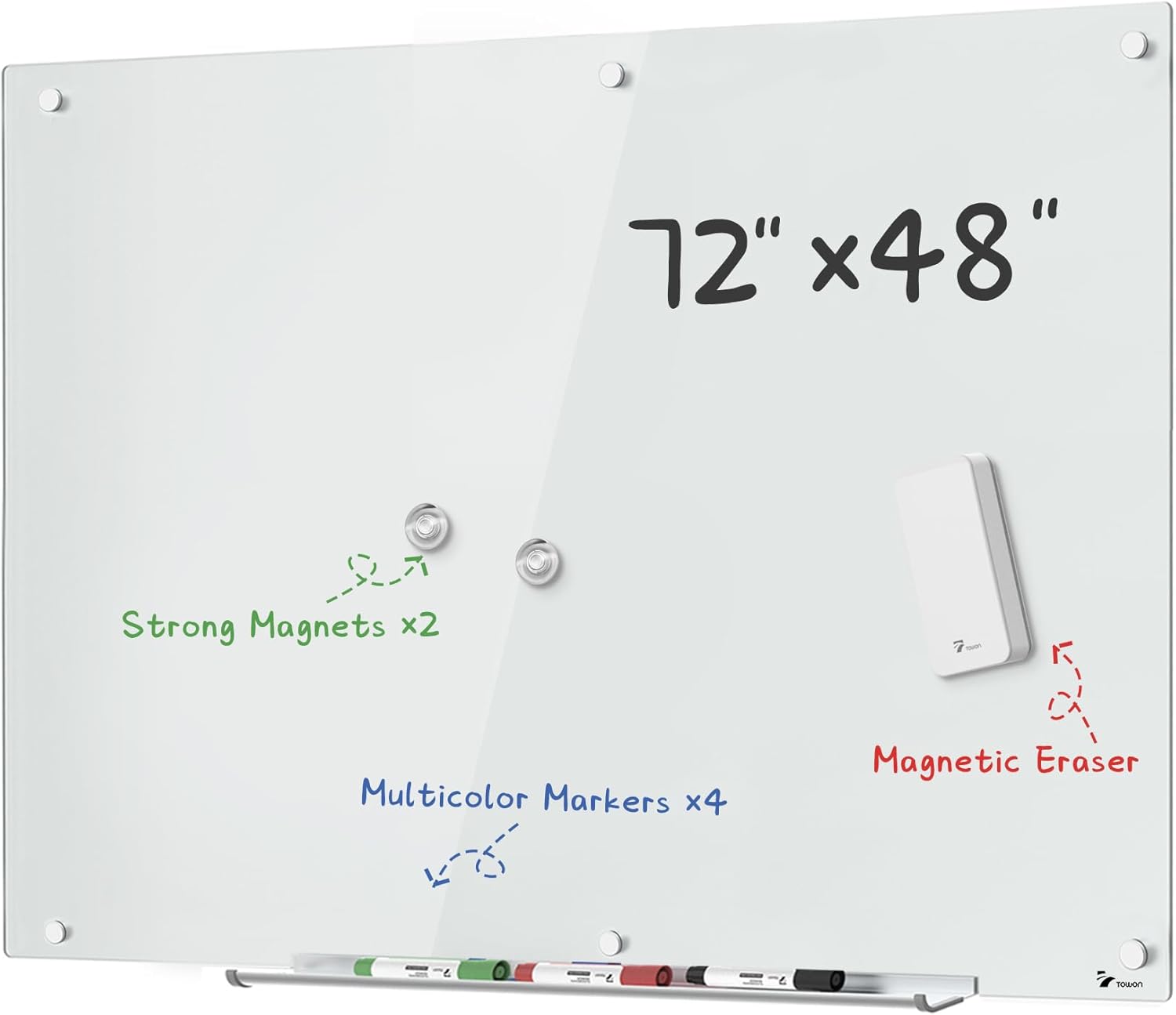 TOWON 6 x 4ft Glass Whiteboard Wall – Magnetic White Dry Erase Board (72 x 48 inches) with Multi-Color Markers, Strong Magnets, Pen Tray & Eraser – Frameless Design for Office, Home & Classroom