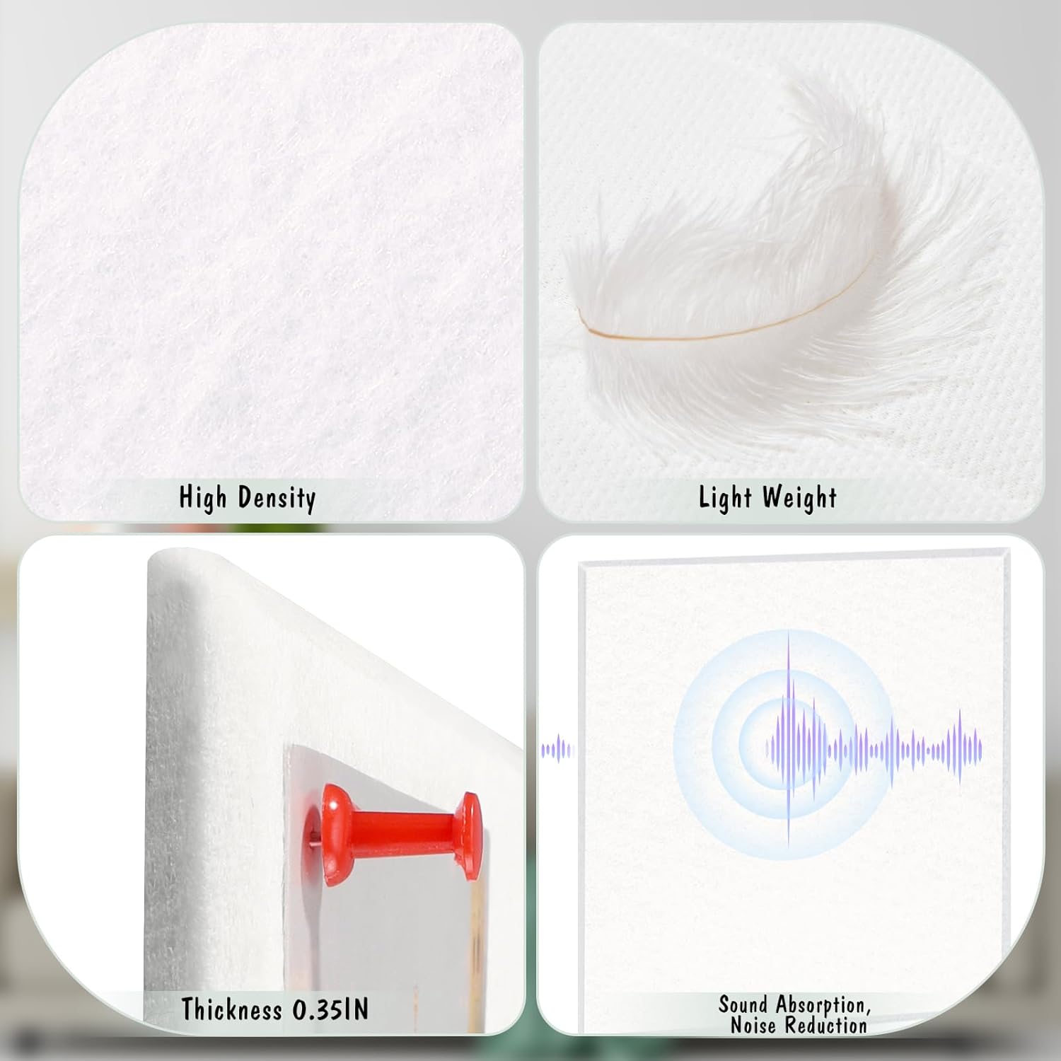 - 【Package Includes】You will receive 6 pack felt wall tiles and 1 box colorful thumbtacks (about 30pcs). The size of each felt wall tile is 11.8" x 11.8" and the thickness is about 0.35". You can splice them into the desired shape and size according to your needs, such as 36" x 24", 12" x 72", etc.