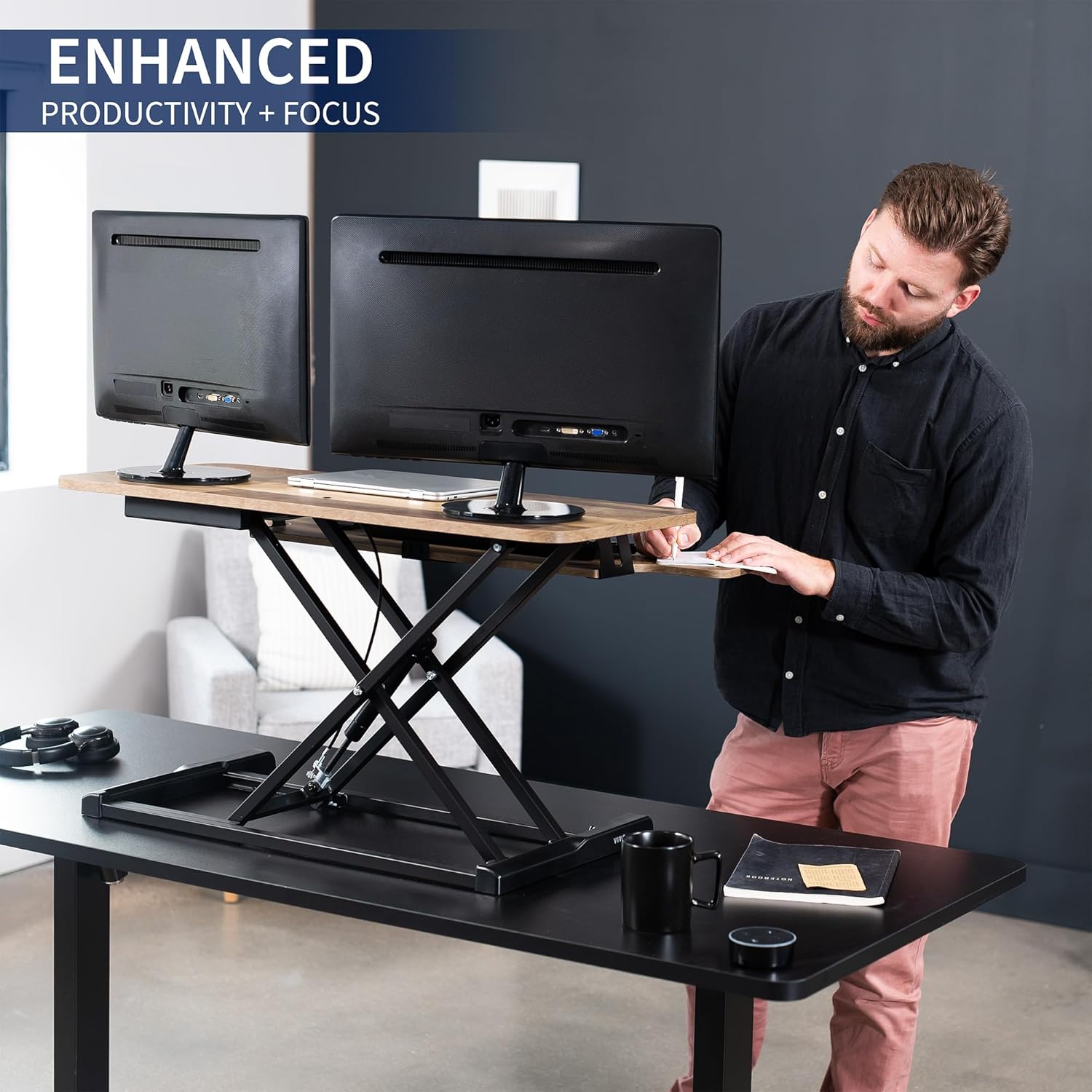 VIVO 36 inch Desk Converter, K Series, Height Adjustable Sit to Stand Riser, Dual Monitor and Laptop Workstation with Wide Keyboard Tray, Reclaimed Wood Top, Black Frame, DESK-V036KP