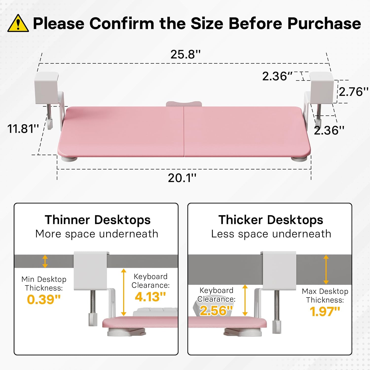 - ❗️ CHECK DESK COMPATIBILITY BEFORE PURCHASE – This under-desk keyboard tray won’t work with desks that have curved, beveled, or rounded edges, or crossbars/support beams underneath. Please check the product images to ensure your desk has a flat, unobstructed underside for clamp installation