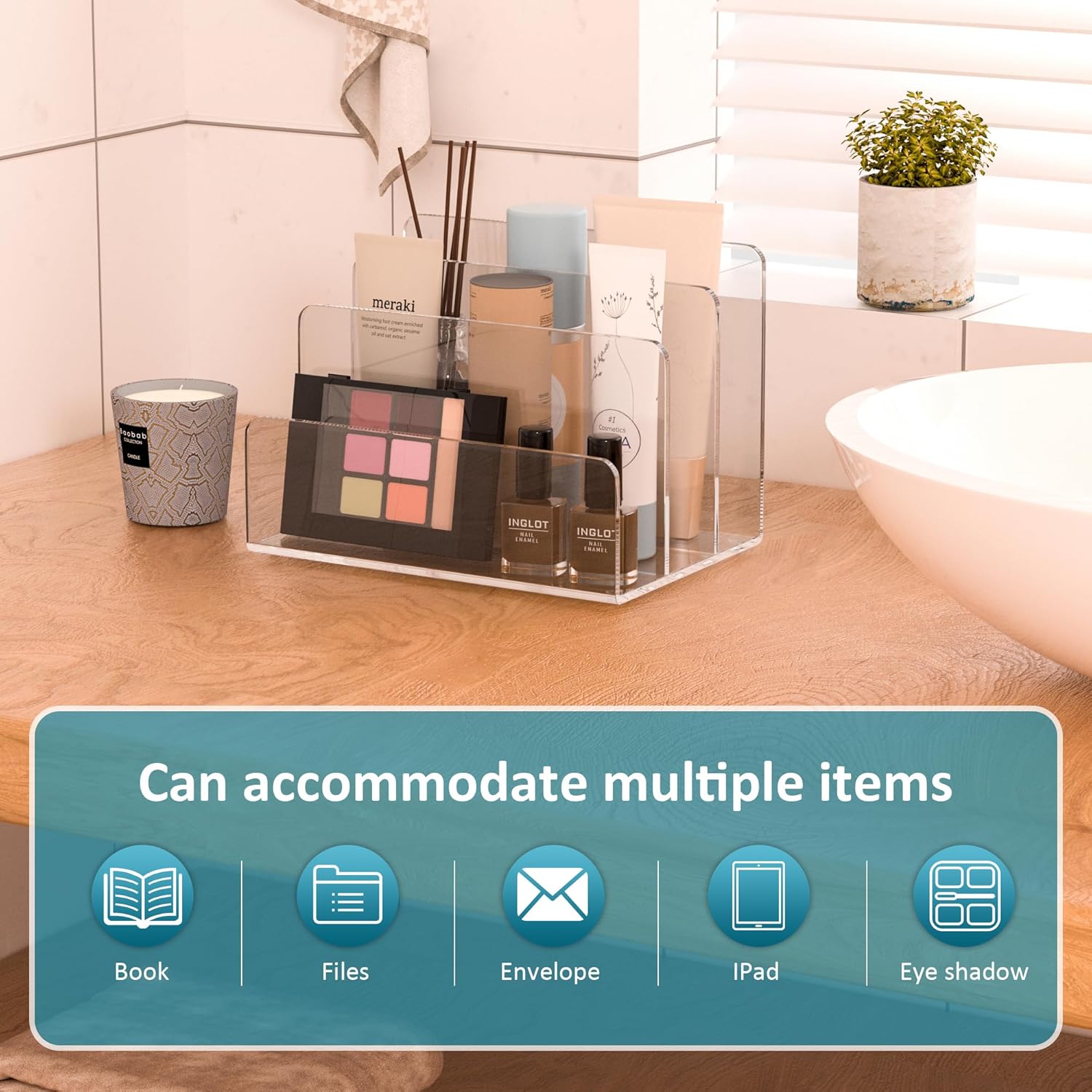 - Wide Application: The acrylic holder can be used for so many items display. It can be used for files, envelope, documents, magazines, phone, letters in your office. Or you can use it for cosmetics,Ipad, vinyls, eye shadows, makeups in your home. Multifunctions for your goods organizer.