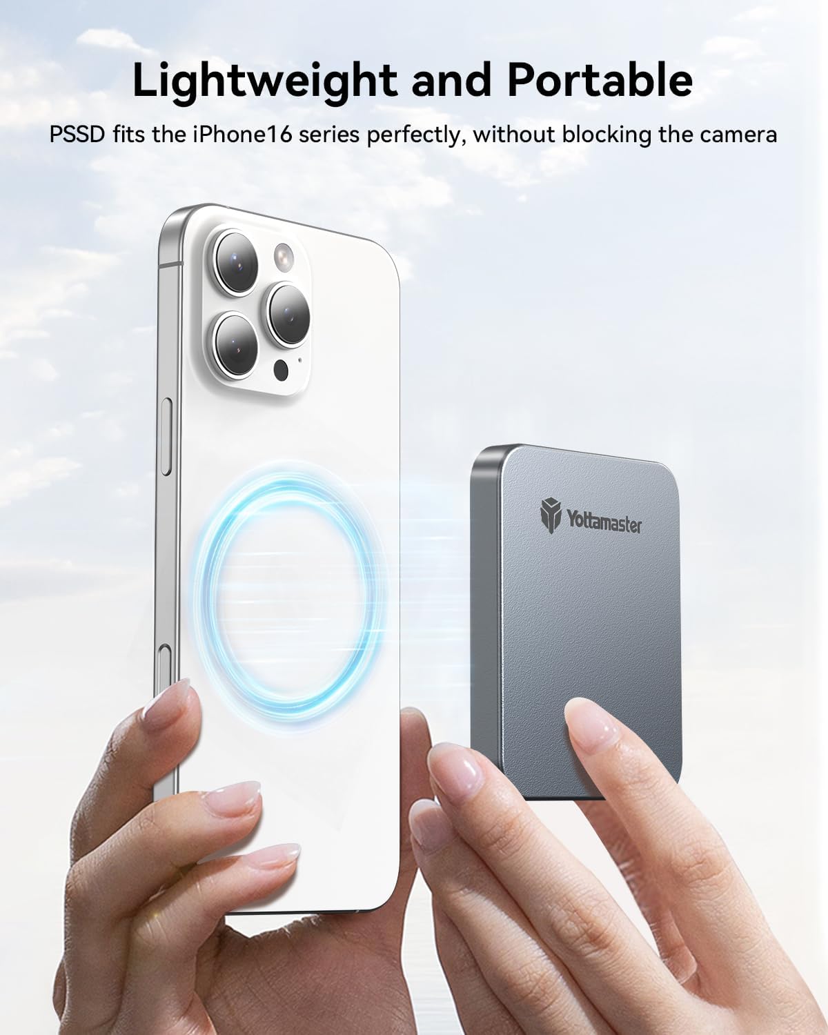 - ăMagnetic DesignăMagnetic pssd 512GB can be directly attached to iPhones and phone cases with MagSafe support, and it also includes a magnetic ring for attachment to devices and cases without built-in magnets. This makes it the ideal choice for mobile photography enthusiasts, allowing you to store a large number of high-resolution photos and videos anytime, anywhere, combining portability and efficiency perfectly.!!Note: When using the PSSD with a phone case, it is recommended to use the included magnetic ring to prevent detachment due to insufficient magnetic force.