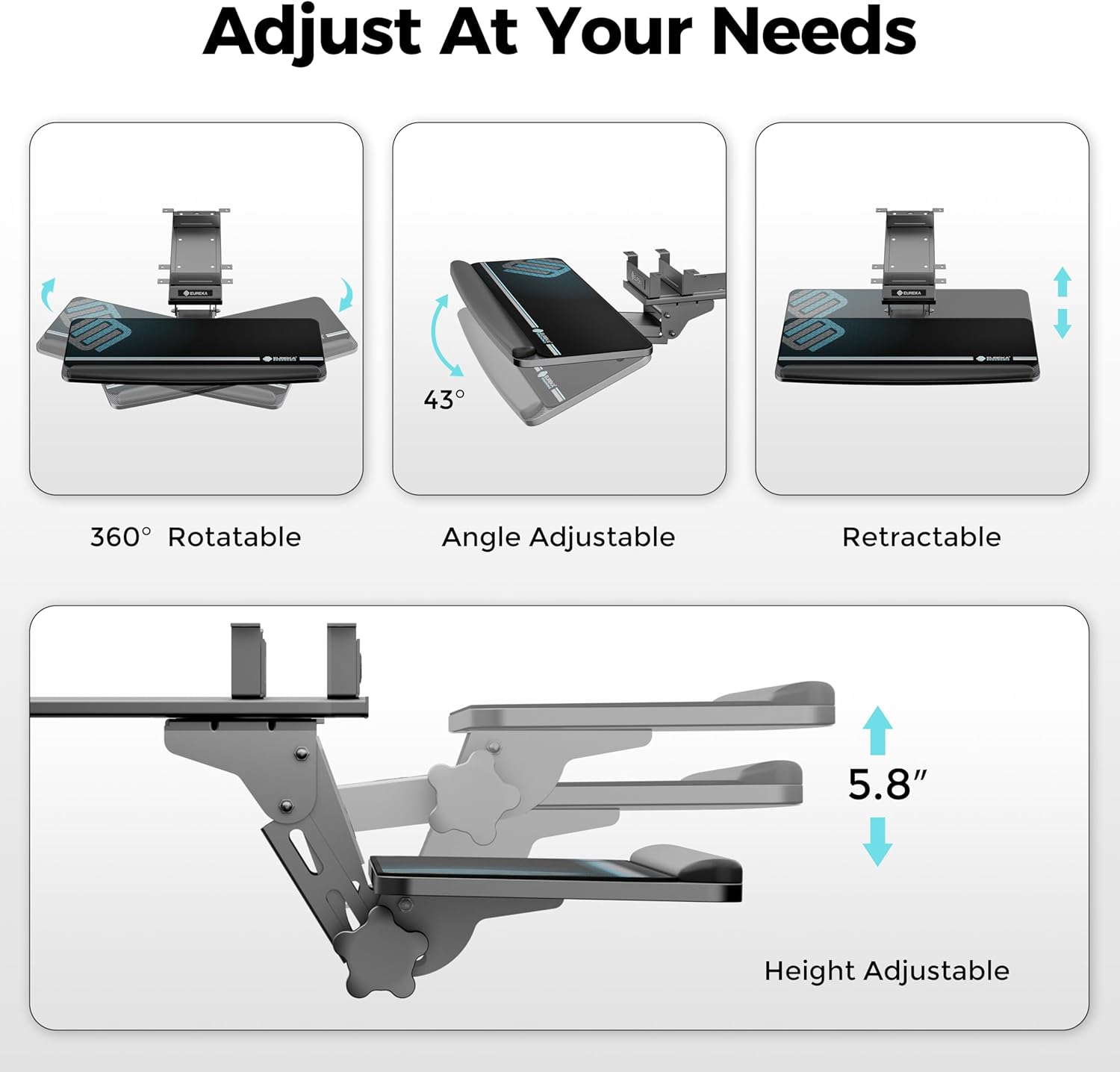 - Ergonomic Full Motion Keyboard Tray: The height adjustable keyboard tray is designed to provide a comfortable typing experience with its full motion feature. The keyboard drawer allows a height-adjustable range of 5.8”. The keyboard holder can rotate/swing 360°horizontally and tilt 43°vertically to your required position and can be pulled forward or backward. Find the perfect position for your typing height and the comfortable position for your arms. This helps to improve typing posture, reduce tension and fatigue, and make it easier for you to work for longer periods of time.