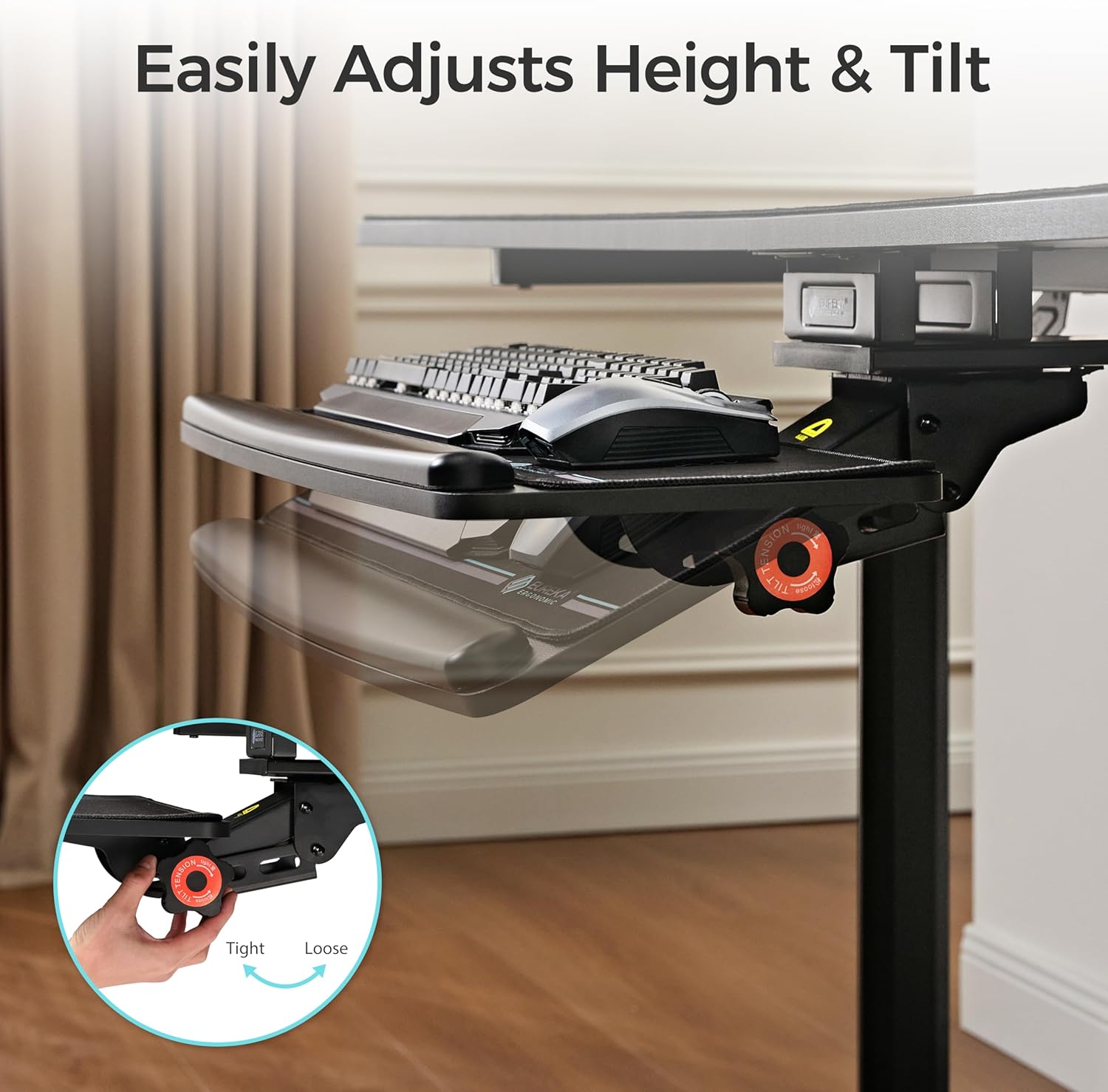 - User-friendly Wrist Rest & Mouse Pad: The keyboard mount comes with a soft wrist rest that prevents the keyboard from slipping when it is tilted. The keyboard desk attachment also provides more comfortable support and helps reduce wrist and arm fatigue. The delicate mouse pad has a smooth surface for precise tracking. The keyboard shelf provides users with a great typing experience. Suitable for various scenarios: office, home, game room, etc.