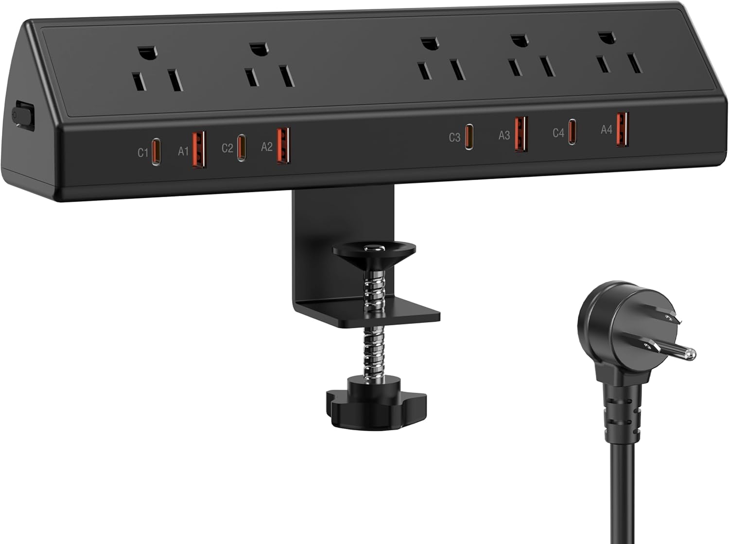 Desk Clamp Power Strip 65W Fast Charging Station,4 PD USB-C,5 Outlets,Nightstand Desk Edge Mount Tower Surge Protector,15 Amp Heavy Duty Power Strip,Fits 1.96" Tabletop Edge (Black, 6 FT Cable)