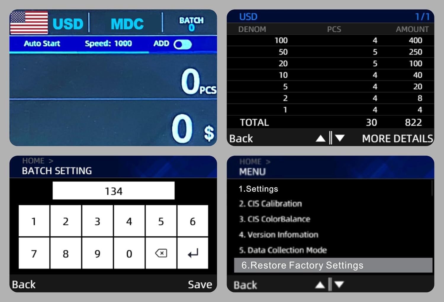 - # What does the Machine Do #: Demotio MA-600S mixed denomination money counter machine can efficiently count and calculate the total quantity and value of mixed bills with Bank Grade counterfeit detection. It can generate detailed reports showing the total quantity of bills and their total value for each type of bills after each counting process. It can also print the above summary through optional receipt printer. The machine is also upgradable for adding new currencies that you may need.