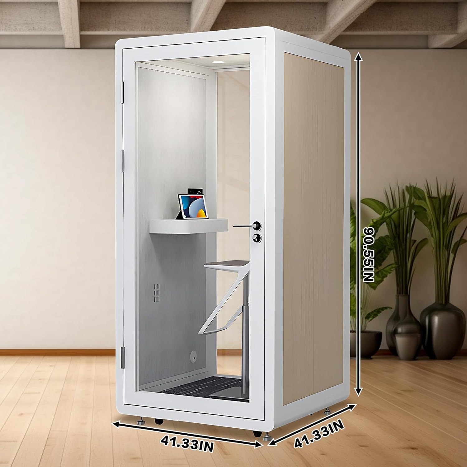 Office Sound Booth with Audio Privacy - Removable Soundproof Booth Includes White with Wood Grain Side Trim,Soundproof Room with Light,Fans, Socket for Singing Room,Telephone Booth (41.33IN)