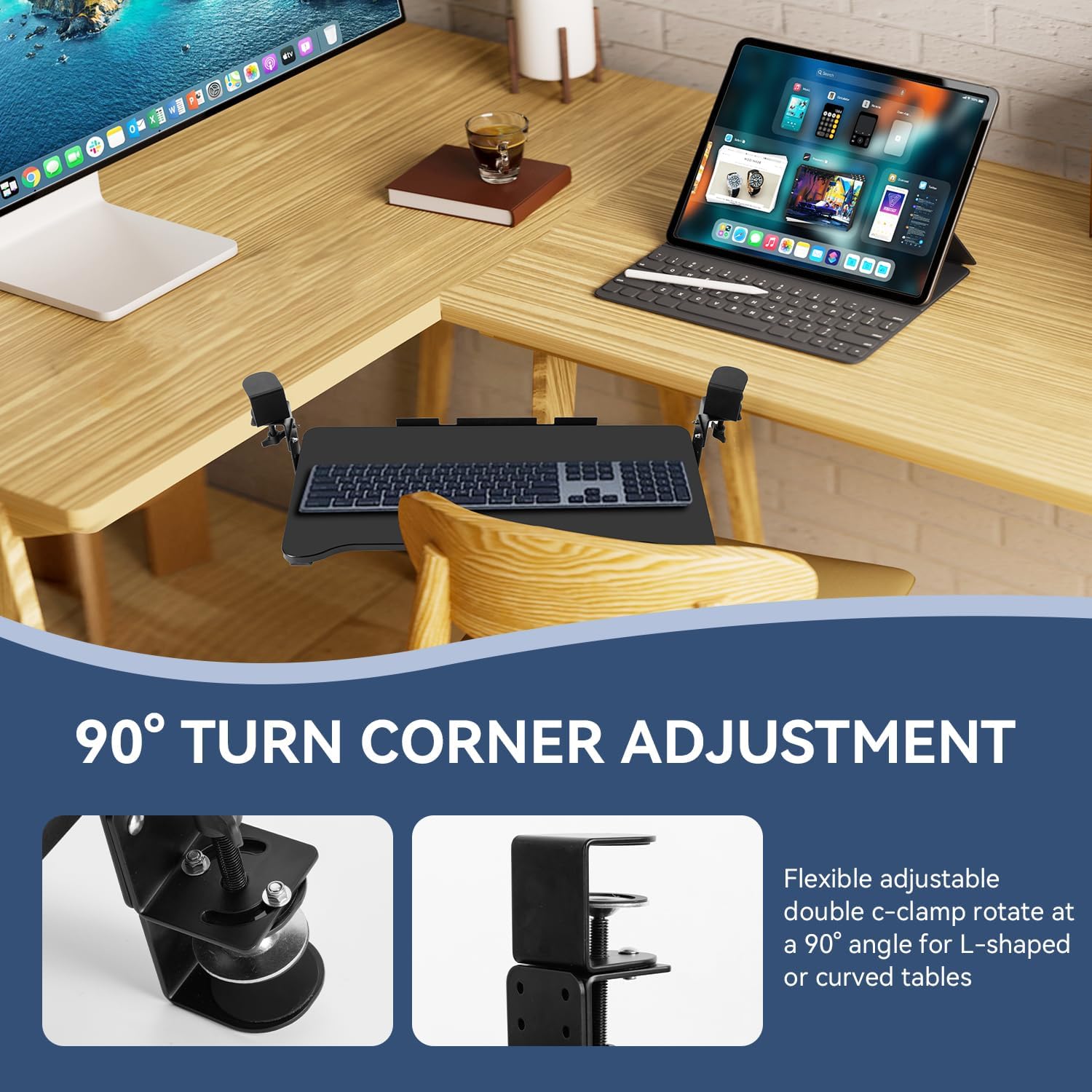 - 【CUSTOMIZABLE HEIGHT & CORNER FIT】Tailor your setup with 3 height adjustment options, ranging from 4.33” to 5.79” below the desk surface. The innovative double C-clamps rotate at a 90°angle, making desk extender compatible with L-shaped or curved desks