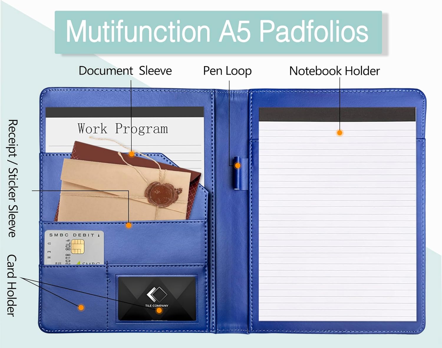 - 【Simple Design Portfolio】The mini portfolio binder has enough pockets in the inside for business cards, ID, notes and a pen loop, looking very professional and elegant. This A5 portfolio is very well made of good quality PU leather and is very easy to carry with you for quick meetings at work or other daily use. (paper and pen are NOT included).
