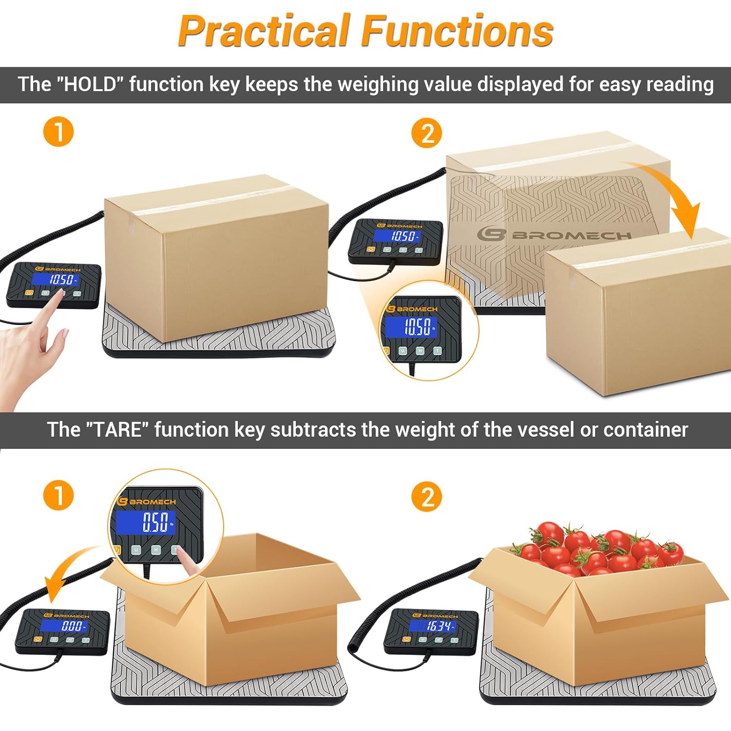 - [Hold & Tare Functions for Accurate and Easy Measurements] The hold function locks the weight display for easy reading, especially with larger or irregularly shaped packages, while the tare function resets the scale to zero after placing a container, ensuring accurate measurements of just the contents.