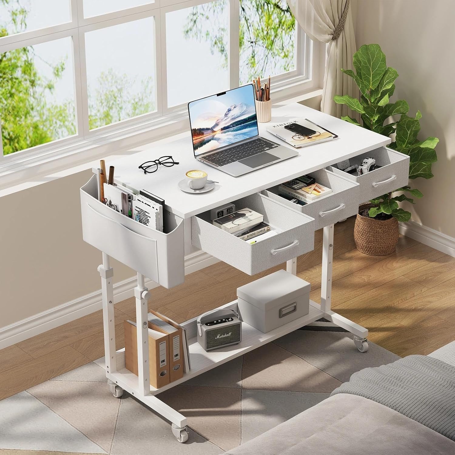 White Portable Rolling Computer Desk - 40 Inch Adjustable Mobile Standing Teacher Desks with 3 Fabric Drawers on Wheels, Couch Sofa Side Laptop Stand Up Table with Storage for Home Office, White