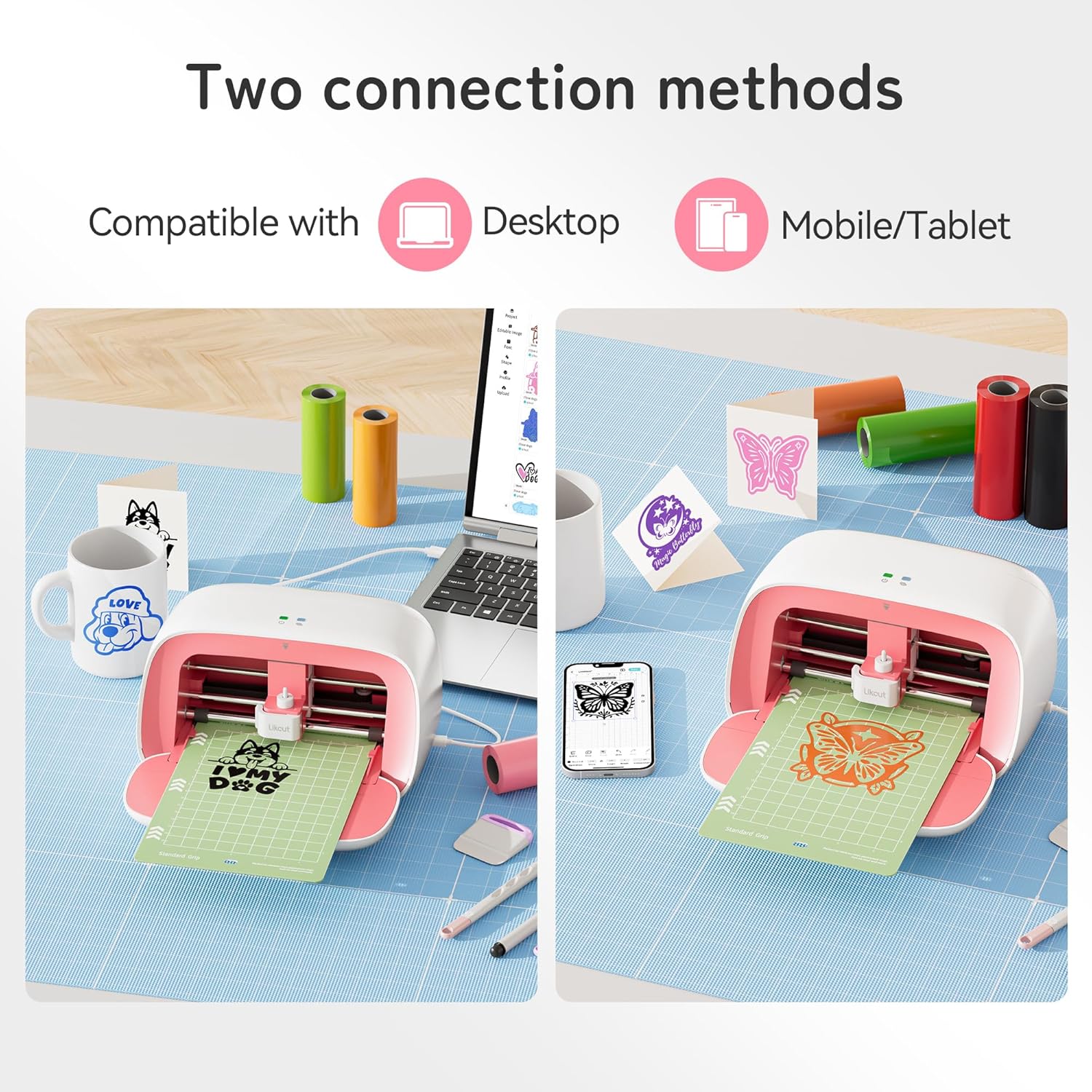 - Likcut Portable S501 Vinyl Cutter: Stylish & functional design, soft pink and white die cutting machine doubles as a chic desktop accessory, 200.8*165.6*124.3mm and 1.95 kg for easy portability and storage, with front storage compartment keeps workspaces organised – no more misplaced tools mid-craft
