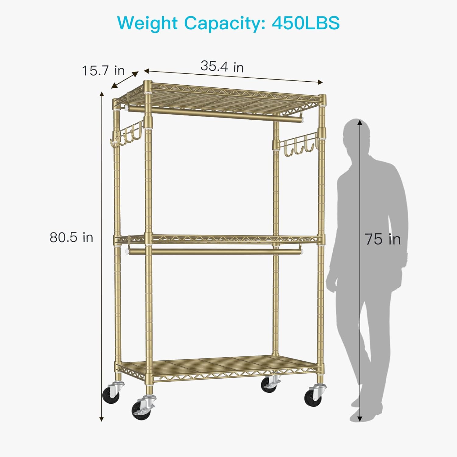 - [Dimension & Load Weight]: 35.4"W x 15.7"D x 80.5"H(Included wheels height). Weight Capacity: 450 LBS. You can move the clothing rack freely when needed