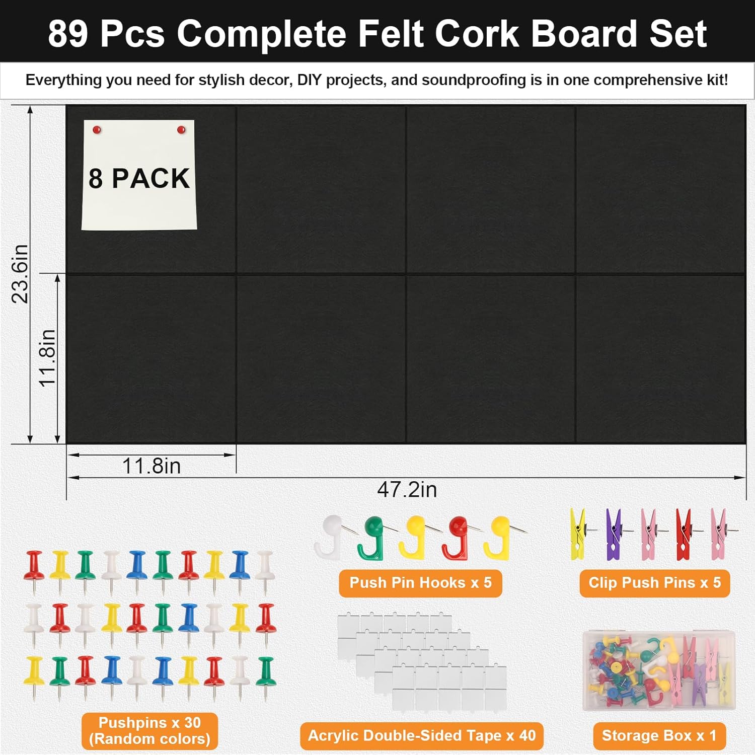 - Ultimate 89 Pcs Bulletin Board Kit: Elevate your space with our comprehensive large felt cork board set featuring 8 precision-cut 11.8"x 11.8" cork boards, 40 removable non-marking adhesive tapes, 30 push pins, 5 push pin clips, and 5 push pin hooks—all neatly packaged. Perfect as a versatile bulletin board for walls, office cork board, pin board, or even a creative dream board or vision board.