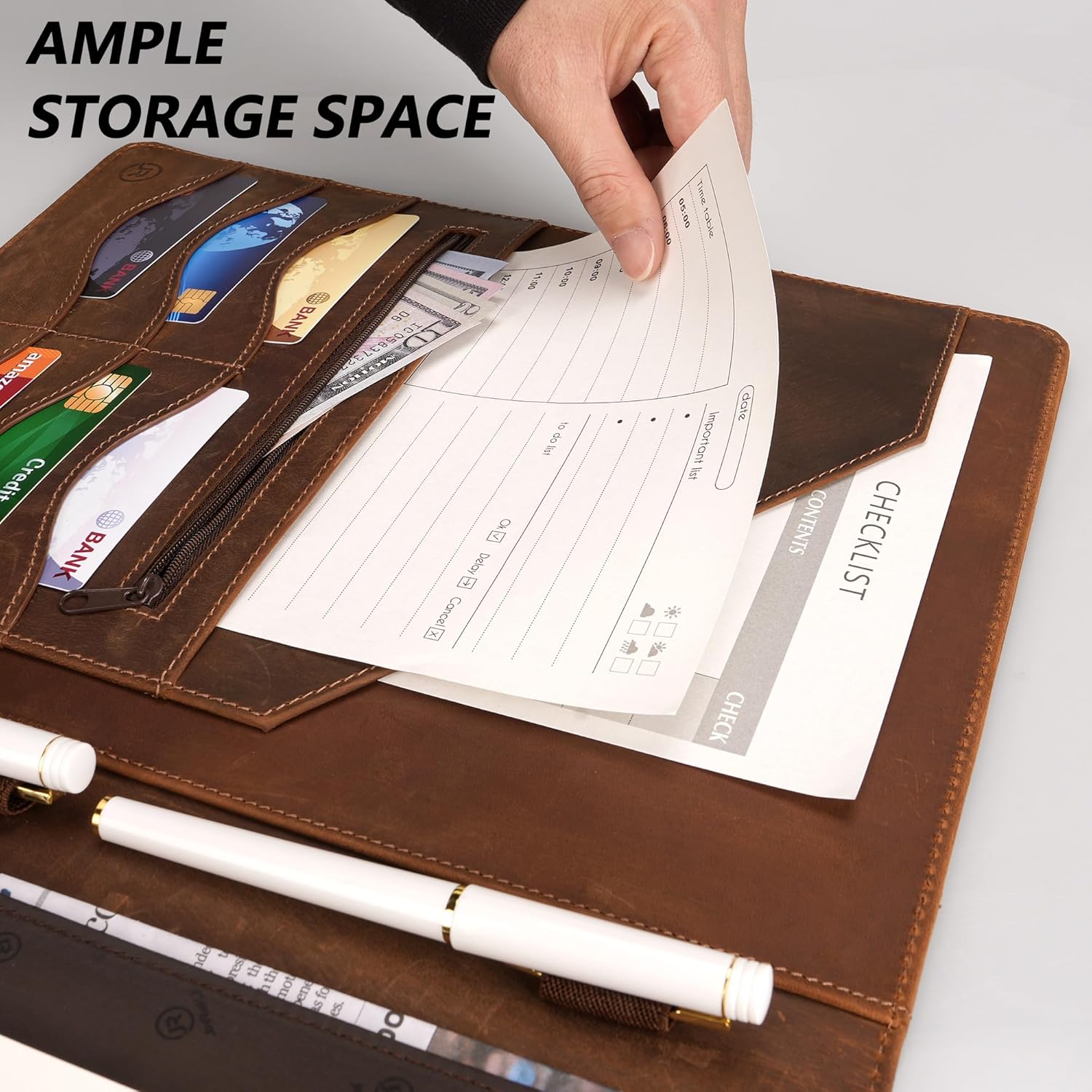 - Premium Full Grain Leather Padfolio: Handcrafted from genuine full-grain leather, our professional portfolio exudes executive elegance and superior quality. The rich texture develops a distinguished patina with age, enhancing its sophisticated appearance. This premium leather padfolio makes a statement in any business setting, reflecting your attention to detail and professional standards.
