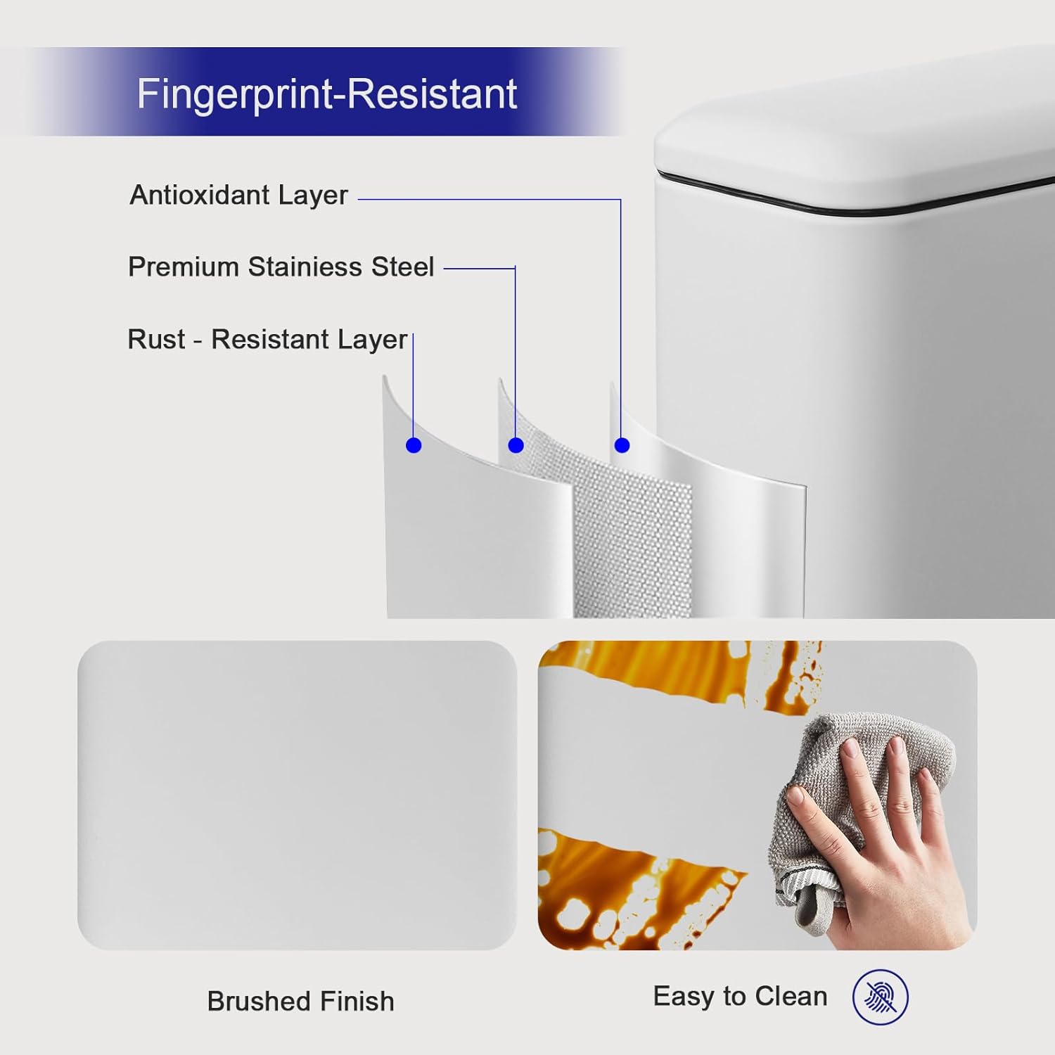 - Odorless & Soft Close lid: Equipped with a tight-fitting lid, this white trash can effectively contains odors and keeps your space smelling fresh, making it ideal for food waste and daily trash.