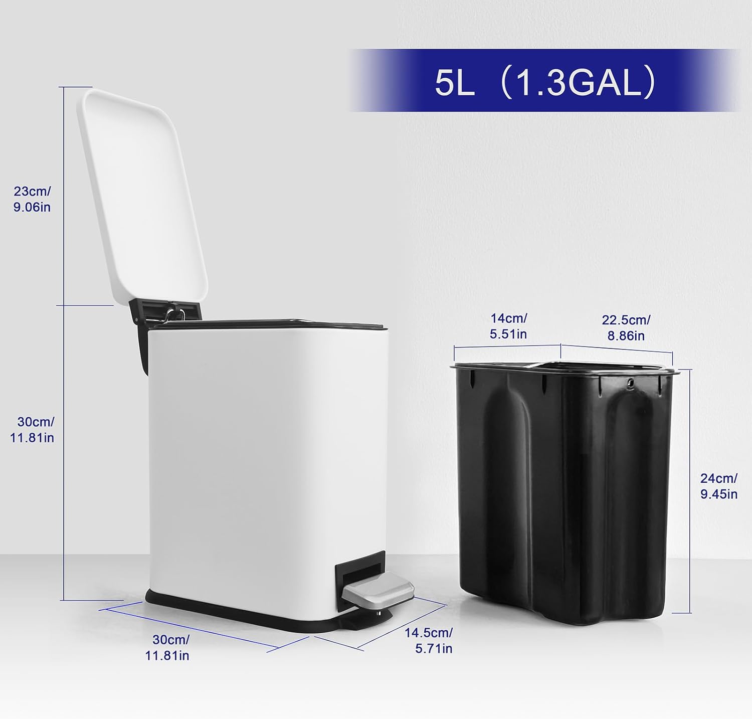 - Space-Saving Design: Perfect for small spaces like kitchens, offices, and bathrooms, this 1.3 gallon slim trash can fits seamlessly into tight corners without compromising on functionality.