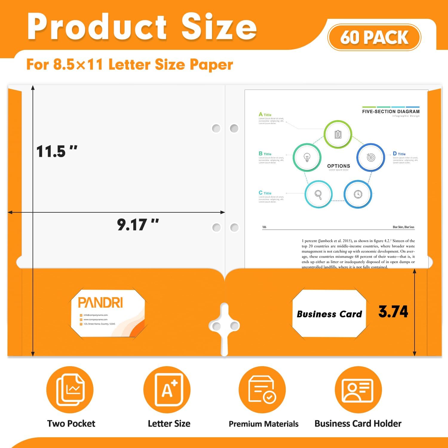 Two Pocket Portfolio Folders, PANDRI 60 Pack 3 Hole Punched 2 Pocket Folders for 3 Ring Binder, Letter Size Paper File Folder for School Office Home Business, Orange
