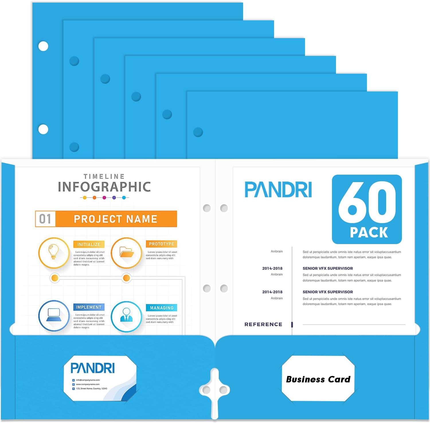 Two Pocket Portfolio Folders, PANDRI 60 Pack 3 Hole Punched 2 Pocket Folders for 3 Ring Binder, Letter Size Paper File Folder for School Office Home Business, Lightblue