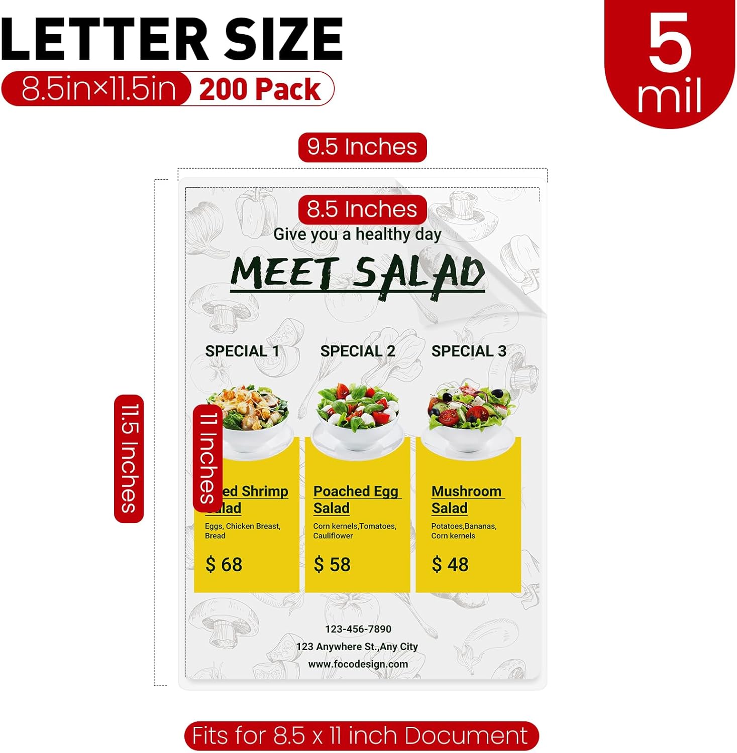 - Laminating Pouches Dimensions: 200PACK , 9" x 11.5", thickness: 5 Mil, fits for 8.5 x 11 inch document