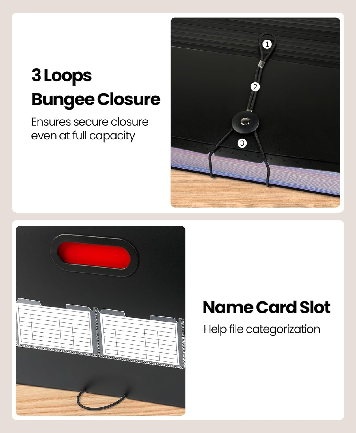 - Deeper Pockets & Unobstructed Tabs: In response to a common issue in accordion folders where papers cover index labels, we've increased pocket height by 0.8 inches (2 cm). This unique enhancement ensures your labels remain visible—a feature unmatched by competitors