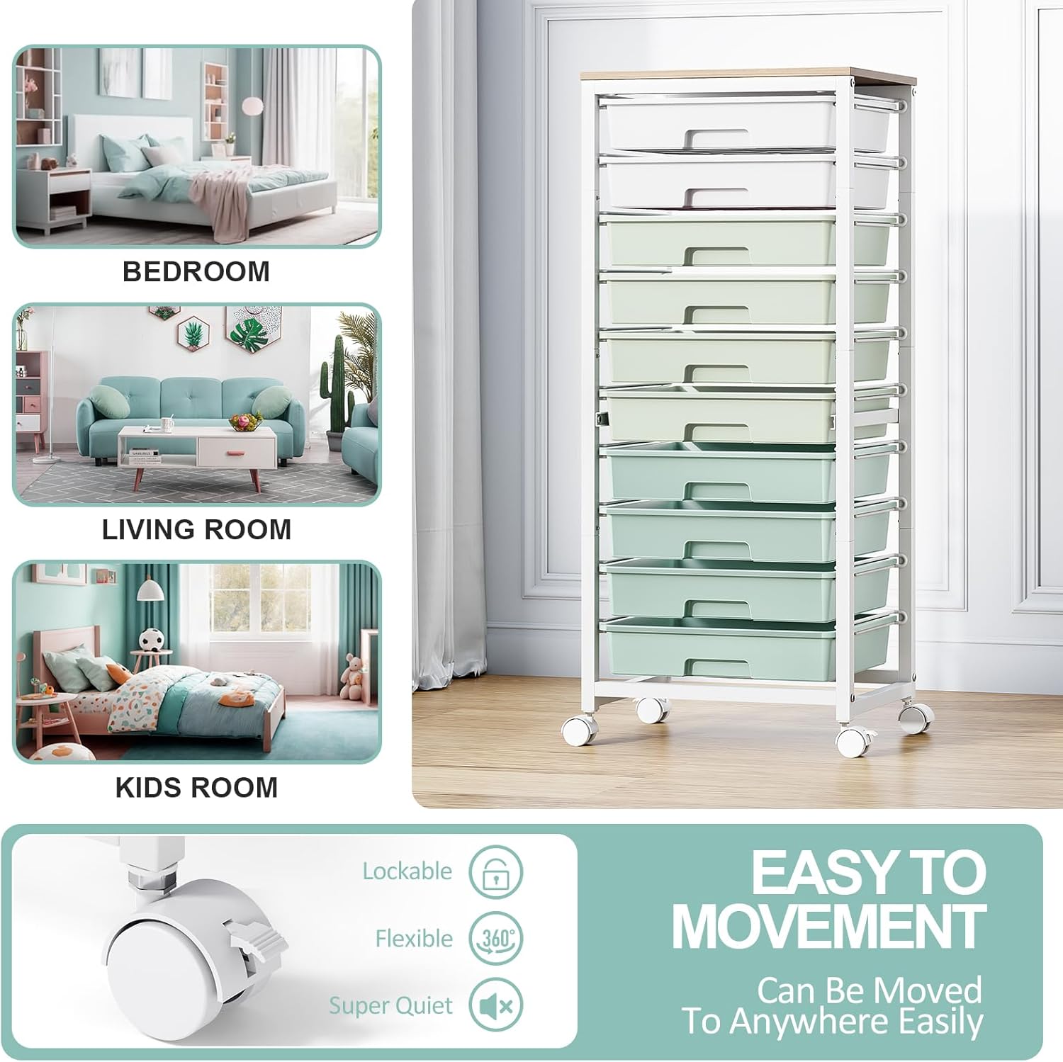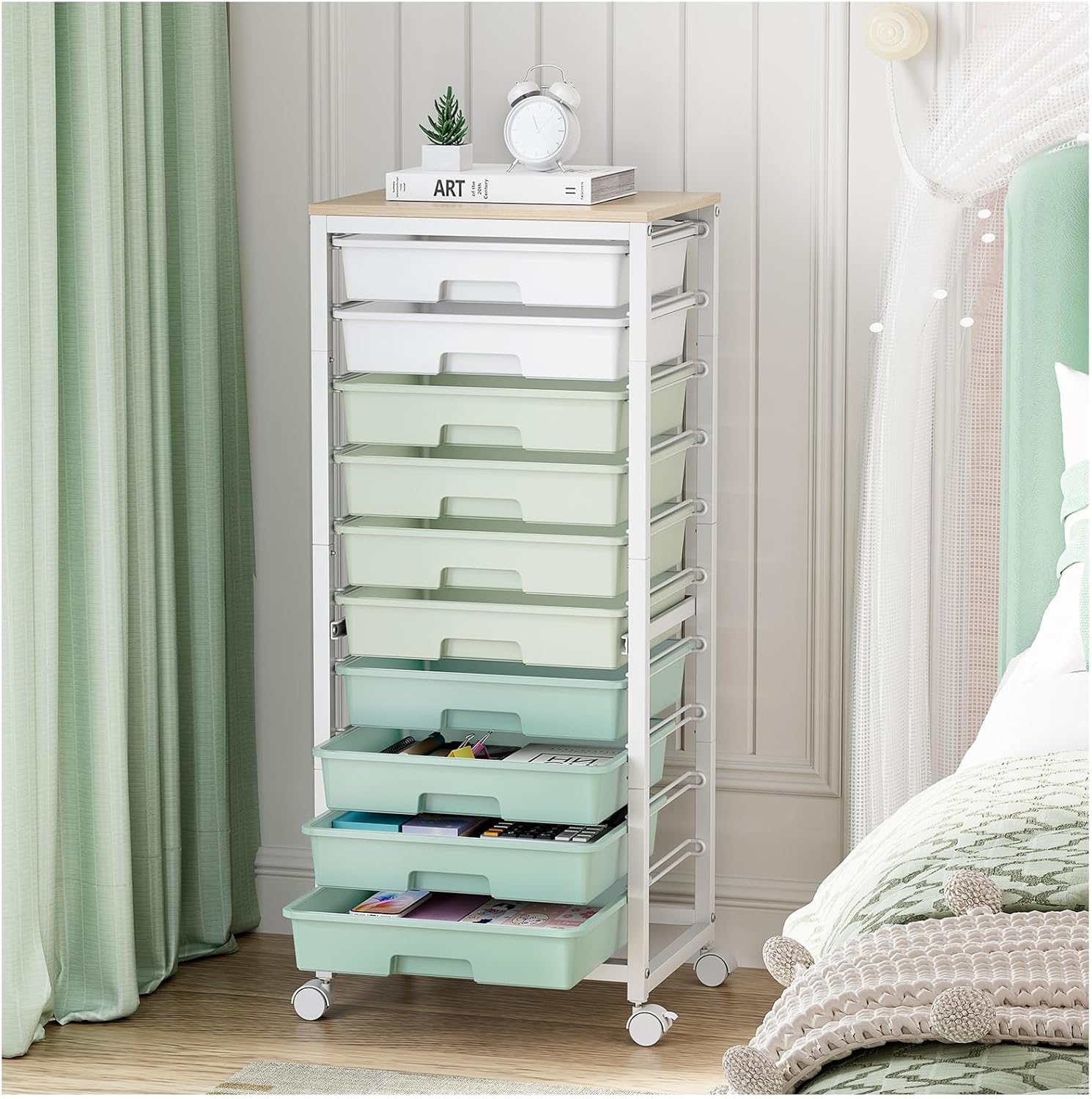 Rolling Cart with Drawers,10 Drawer Rolling Cart,Storage Cart,Utility Cart,Teacher Cart for Classroom Storage,Craft Cart with Wheels and Wooden Tabletop,Green