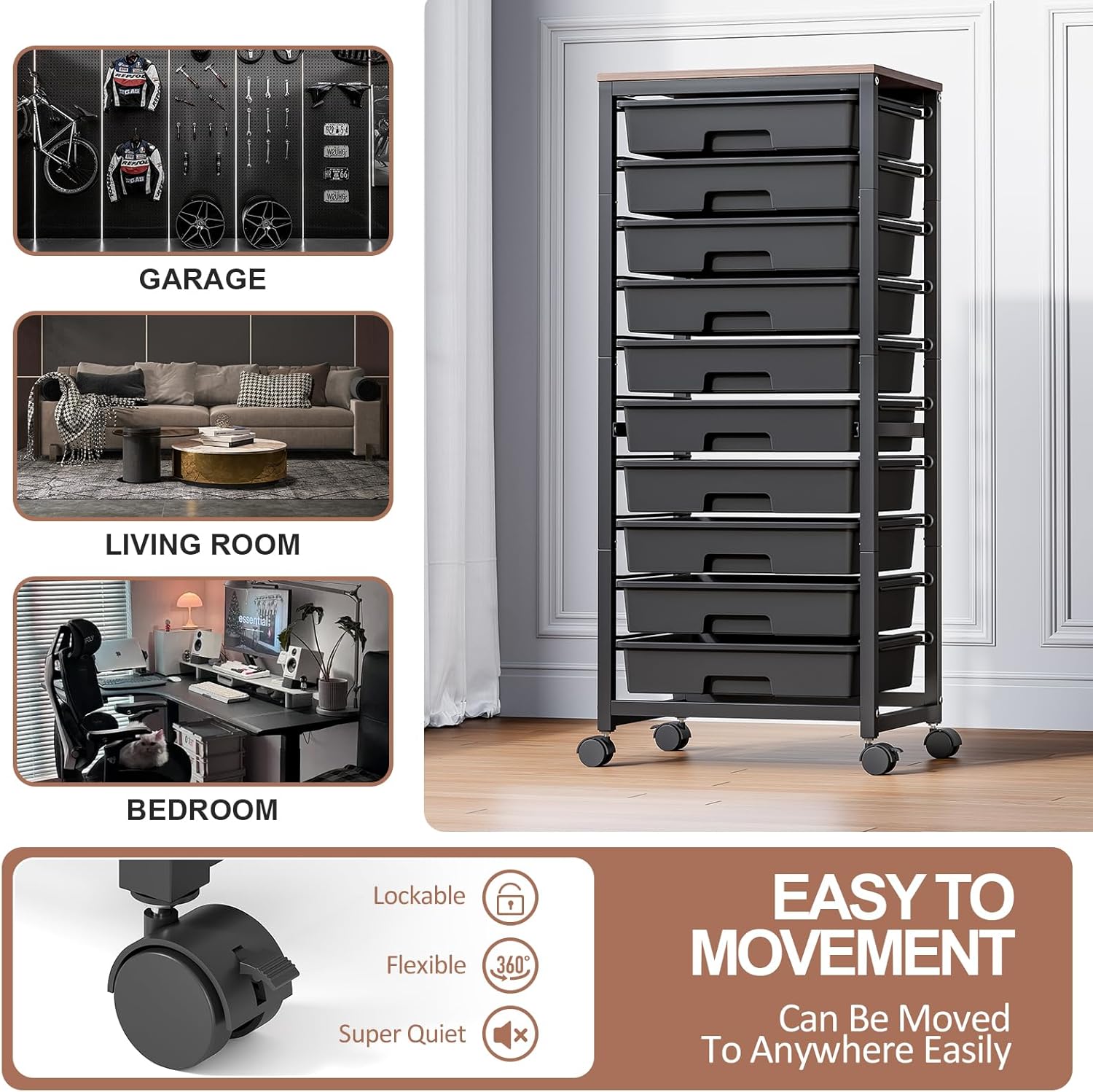 Rolling Cart with Drawers,10 Drawer Rolling Cart,Storage Cart,Utility Cart,Teacher Cart for Classroom Storage,Craft Cart with Wheels and Wooden Tabletop,Black