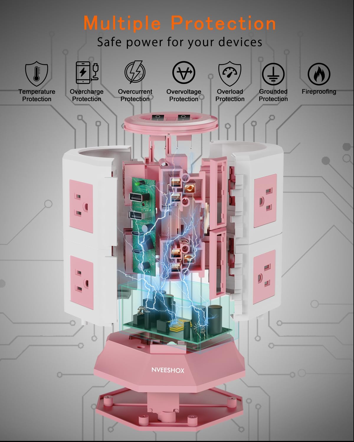 - POWER SUPPLY WITH MULTIPLE PROTECTIONS: surge protector power strip tower with overload protection protect your appliances from lighting, surges, or spike pulses. Minimum energy absorption capacity of 1080 Joules. When the current exceeds 1250W, the integrated circuit breaker on the bottom button automatically shuts off the power strip, providing overload protection, short circuit protection, overcurrent protection and overheating protection for all outlets.