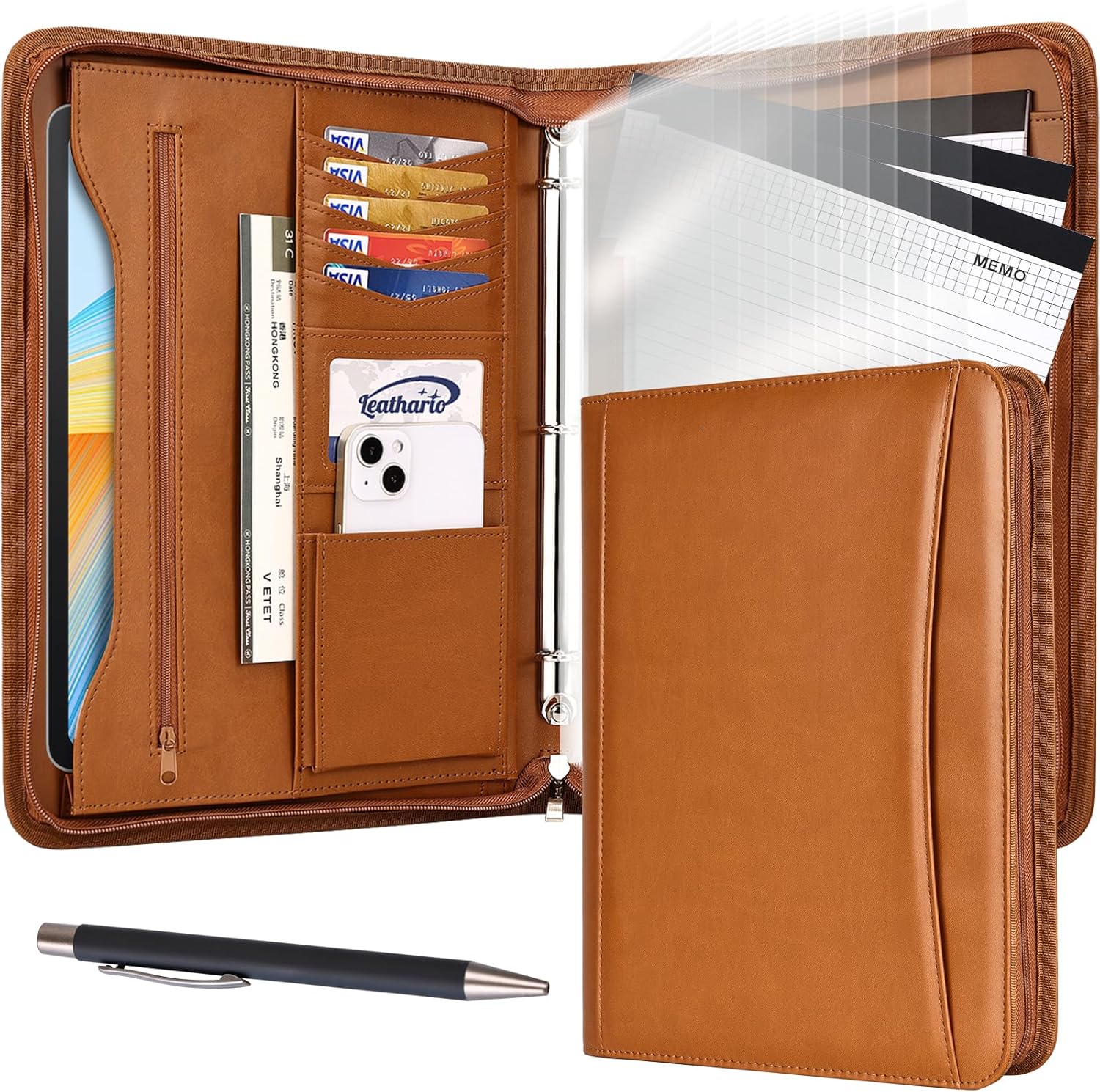 Leathario Portfolio Binder, Includes 10 Sheet Protectors and 3 Notepads, 3-Ring Folder Organizer, A4 Padfolio with Zipper, Vegan Leather Tablet Sleeve, Business Office Conference Clipboards