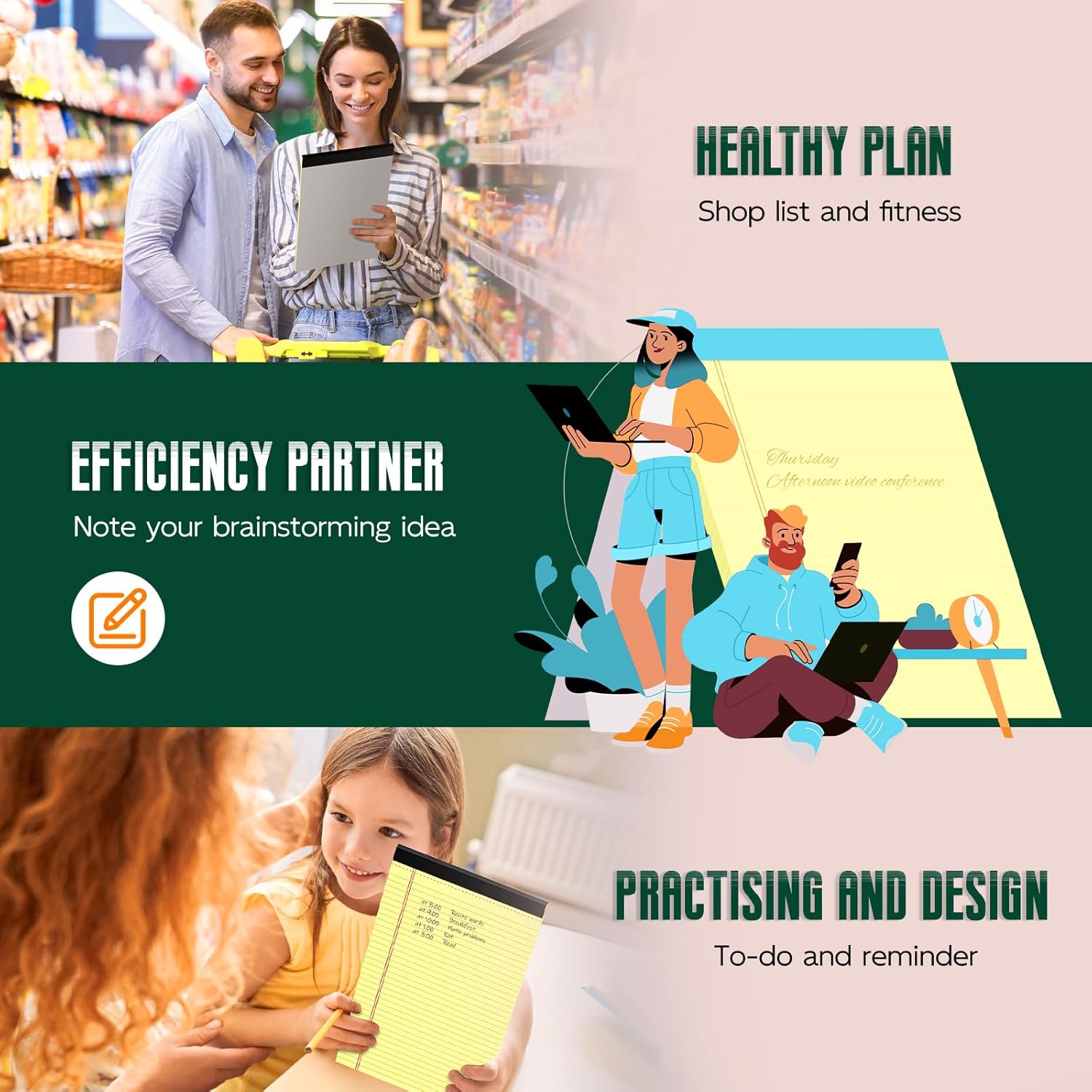 - 【Double-Sided Printing】The 8.5" x 14" yellow note pads is designed with double-sided printing, providing you with twice the writing space without wasting any paper. The yellow notepads 8.5 x 14 with smooth paper, clear lines and colors, free of fibers without letting the nib bleed through to the back of the paper, helping record your unconstrained thinking and special moments, you don't need to worry about the inspiration being forgotten.