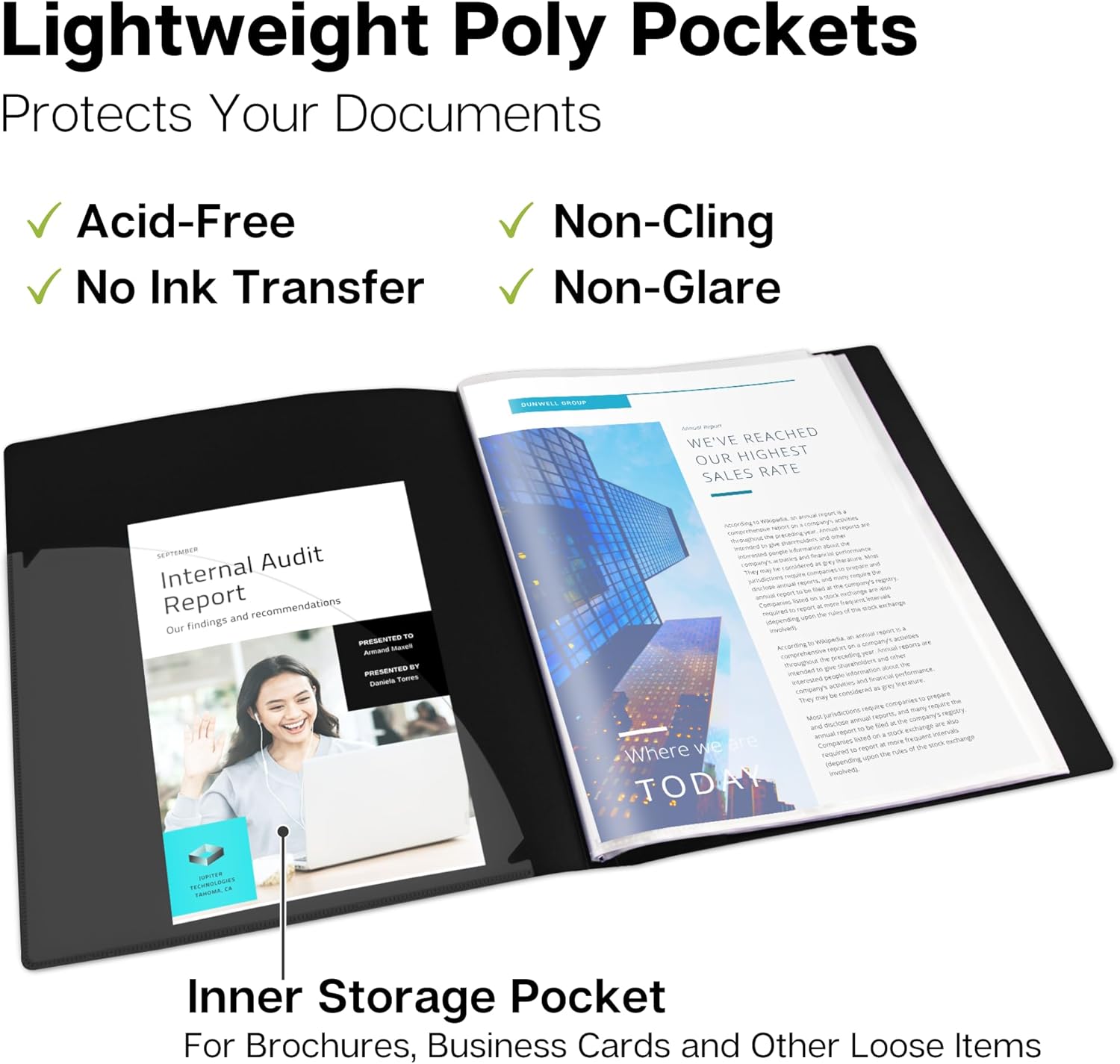 - DURABLE CONSTRUCTION, BUILT TO LAST: Premium plastic covers, reinforced binding resist tearing. Non-glare poly sleeves are dirt and moisture resistant, for a professional appearance every time.