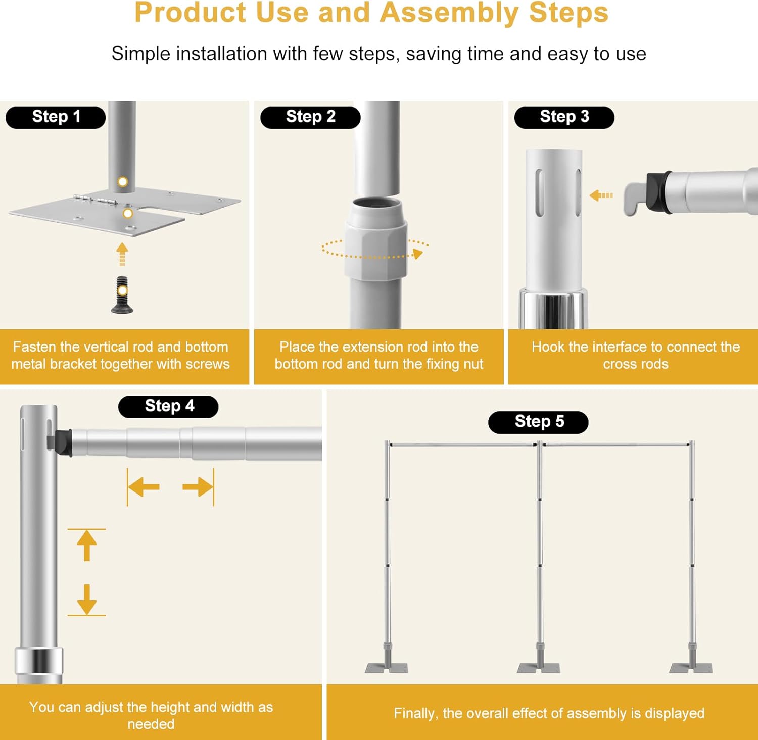 - 【Adjustable Backdrop Stand】The Pipe and drape back drop stand for party can be freely assembled into different sizes according on your needs, photo backdrop stand kit is adjustable