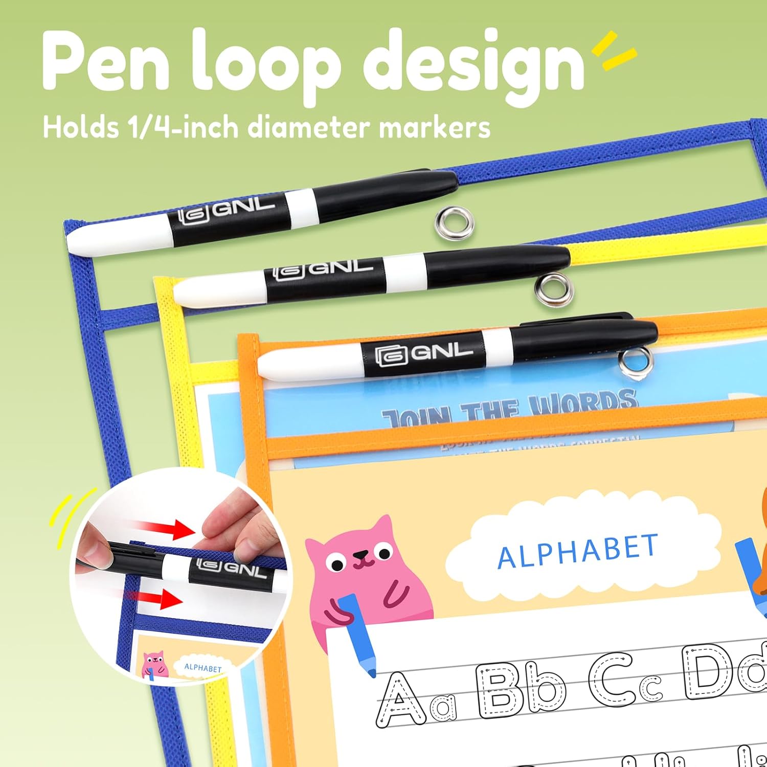 GNL Dry Erase Pocket Sleeves 30 Packs, Reusable Clear Plastic Ticket Holders with Rings, Durable & Easy-to-Erase Sheet Protectors, Assorted Colors 10x14 Inch for Classroom & School Teacher Supplies