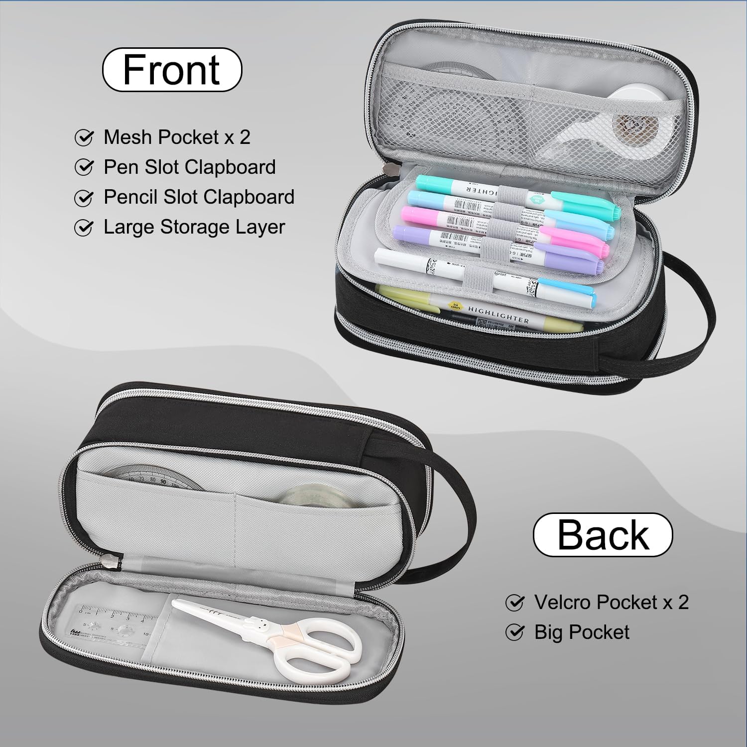 - Multi Pockets Design - Use this multifunctional pencil pouch to keep your stationery organized, it has 2 mesh pockets, 2 pencil slot clapboards, a large-capacity storage layer, and 2 velcro pockets, a big pocket.