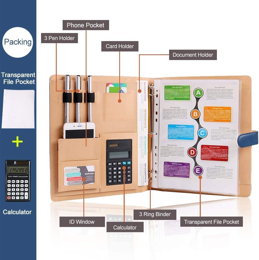 - Professional Padfolio: Equipped with calculator, Transparent file pockets, Various inside pockets and slots capable of holding cards,documents & pens.