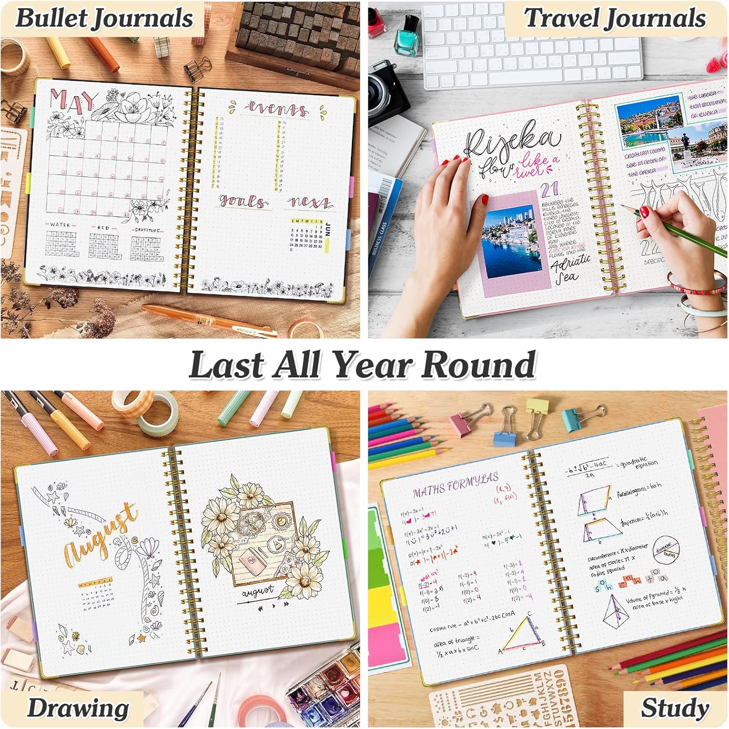 - 【Thoughtful Dot Grid Journal Notebook】Bullet Journaling notebook includes an elastic closure band to keep it securely closed and features an expandable back pocket for storing loose notes or cards. Additionally, it comes with 24 colorful tabbed stickers for easy sectioning and note classification, perfect for school, office, home, work organization, college, business, adults. Additionally it comes with 2 journal stencils for DIY your journaling.