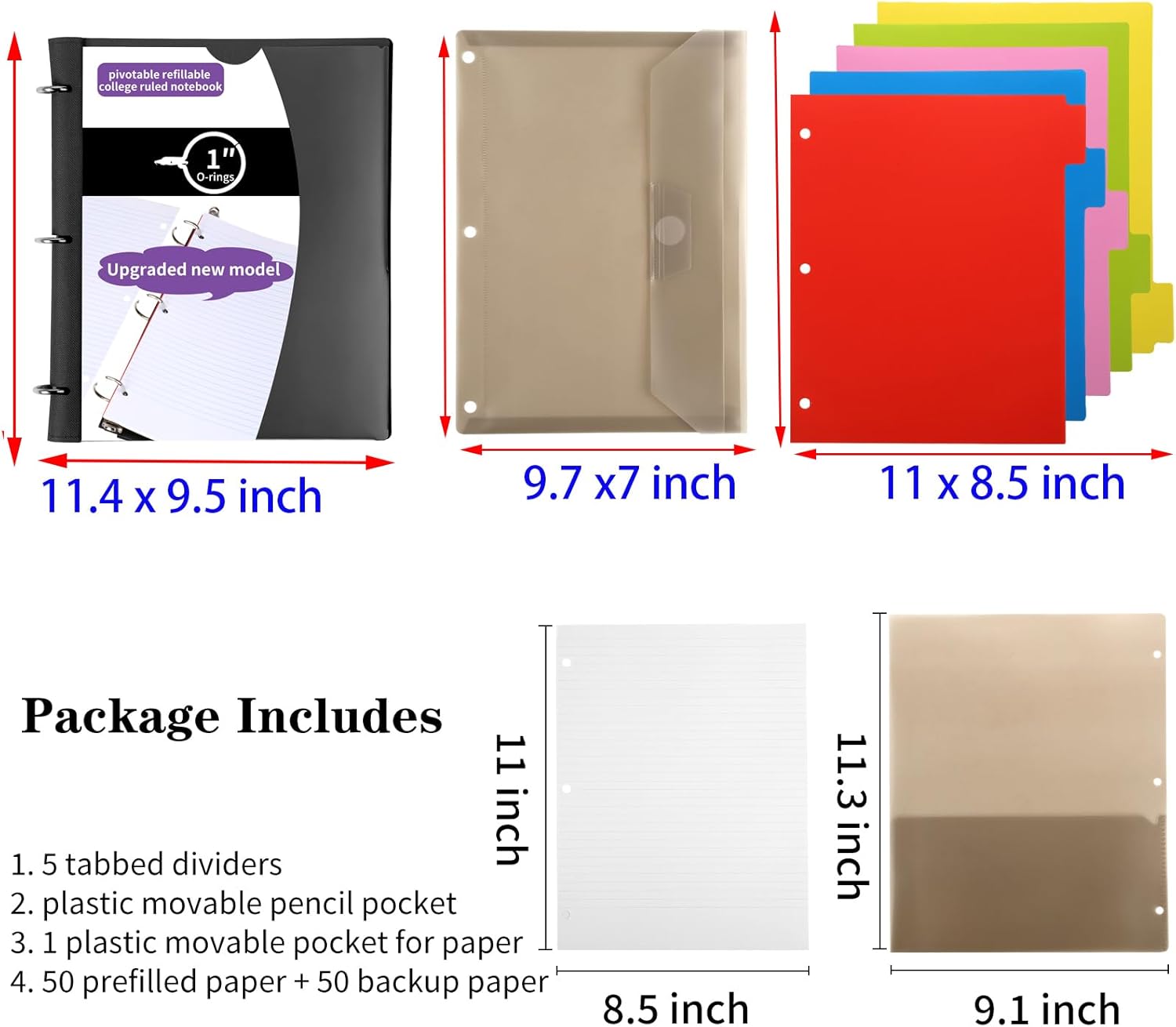 - This notebook with dividers and pockets comes prefilled with 50 pieces of 8.5"x 11" college ruled paper, 50 backup papers, 5 colored tabbed dividers,1 semi-transparent divider with 3 pockets, and 1 movable pencil pocket. This 3 ring notebook dimensions are 11.4" x 9.5". Normally, in back-to-school season, you need to buy 5 subject notebooks and 1 binder, but now, with this all-in-one notebook, you only need to bring one, which can greatly save your backpack space.