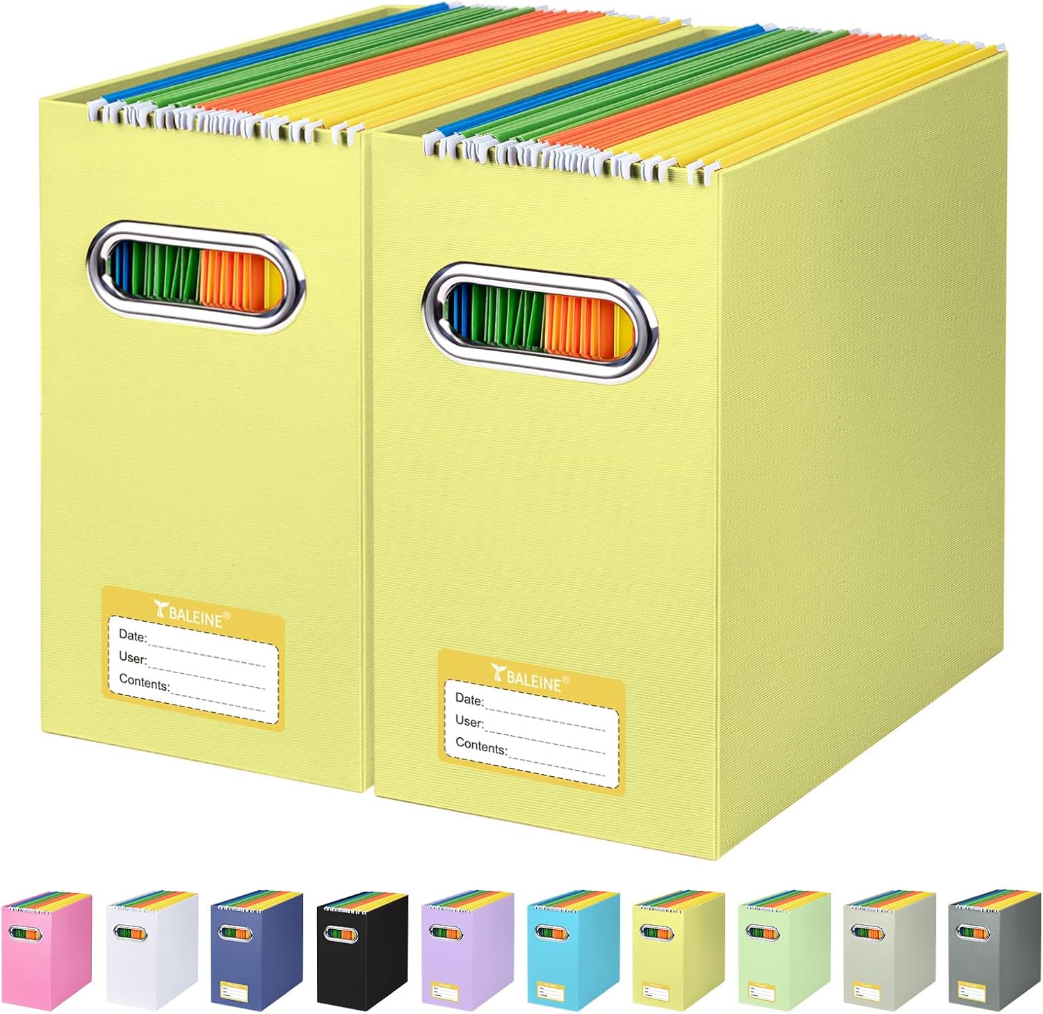 BALEINE File Organizer Box, Cardboard File Folder Organizer with Handle for Letter Size, Portable Collapsible Hanging Filing Box for Home Office Document Storage (2 Pack, Yellow)
