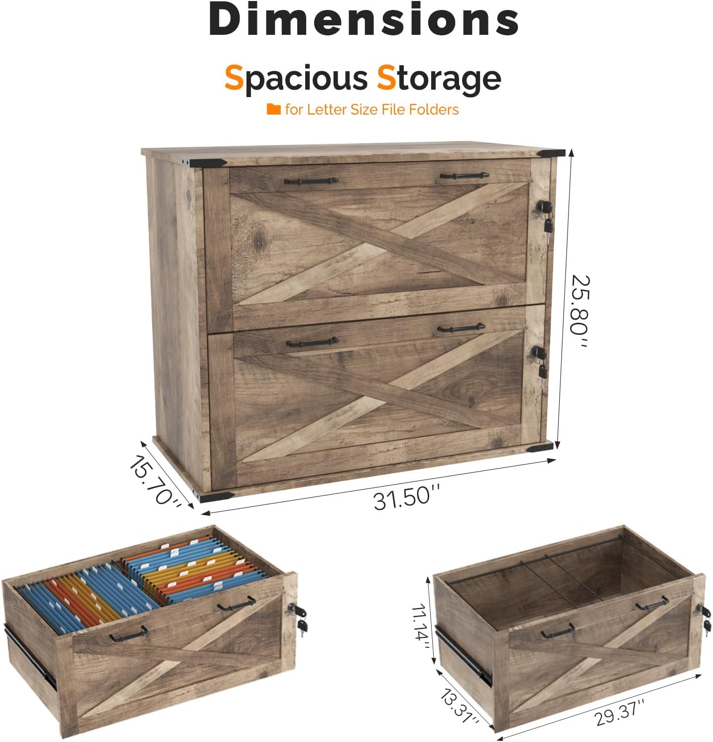 - ăCharming Farmhouse StyleăThis file cabinet, with its barn door elements and ingenious appearance design, showcases unique charm and stands out, adding farmhouse charm to your home while also being able to enliven any office, study or living room.